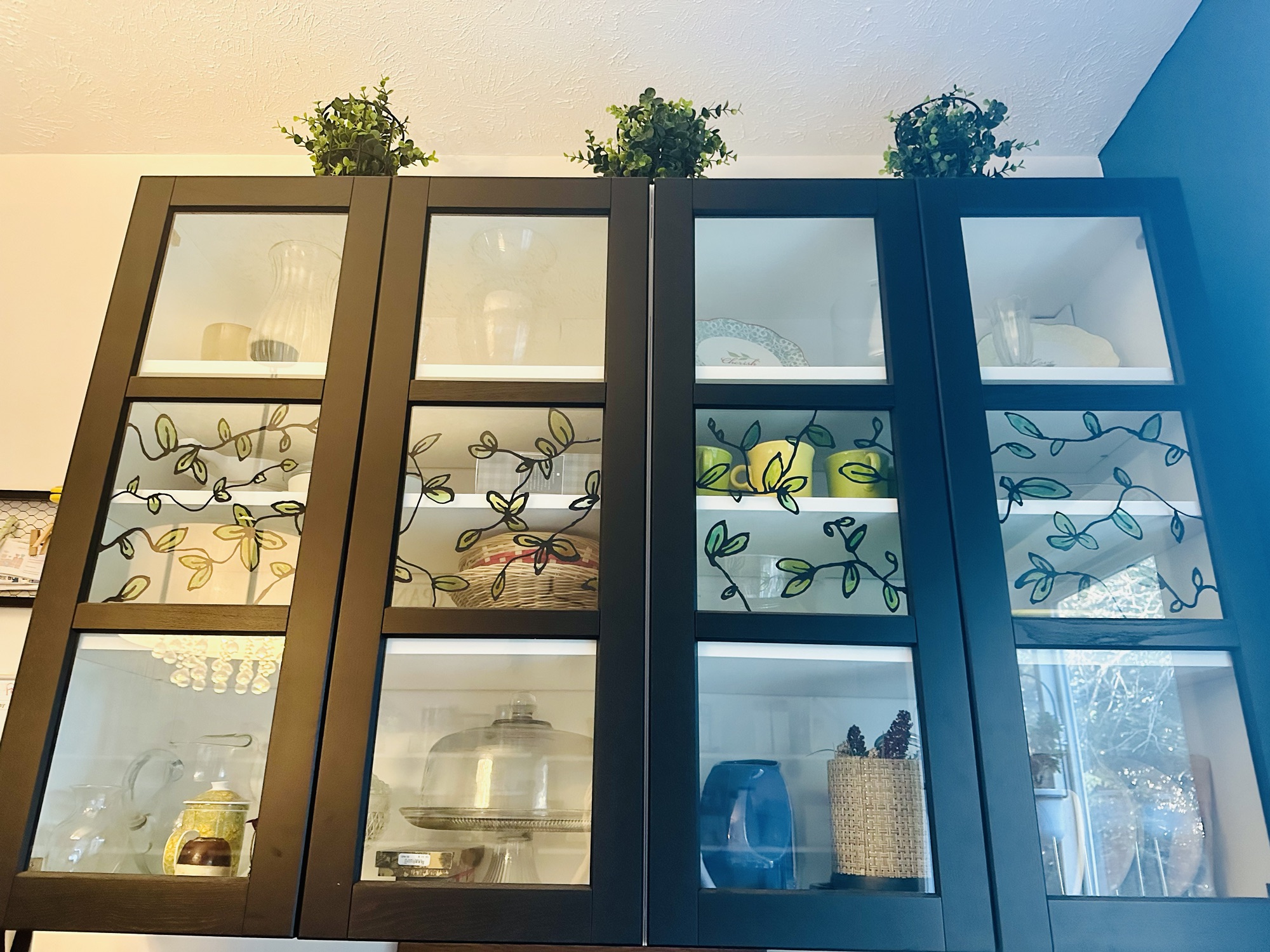 I put this off for so long largely because I thought I’d have to take the doors down in order to paint them for real, but after painting vases vertically (see how I did that at “Faux Stained Glass Vase”), I realized the liquid leading didn’t drip like I’d thought it would! This meant I could leave the doors in place and just paint them as they were. I didn’t even have to empty the cupboards at all. Phew!!