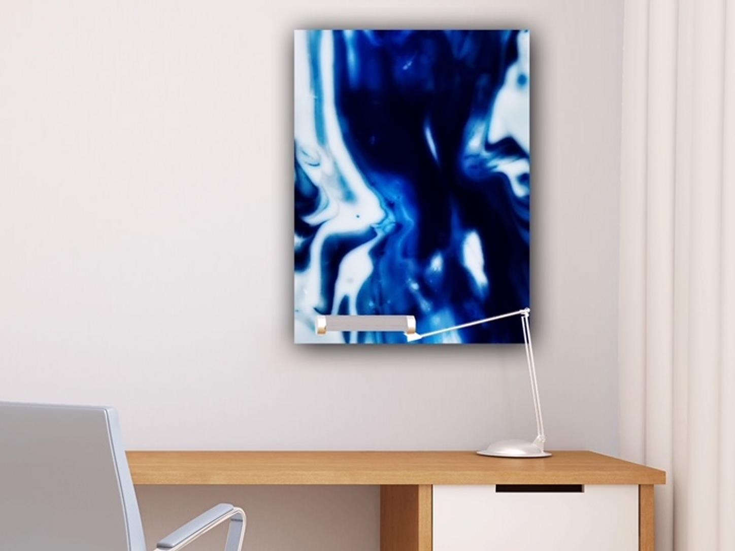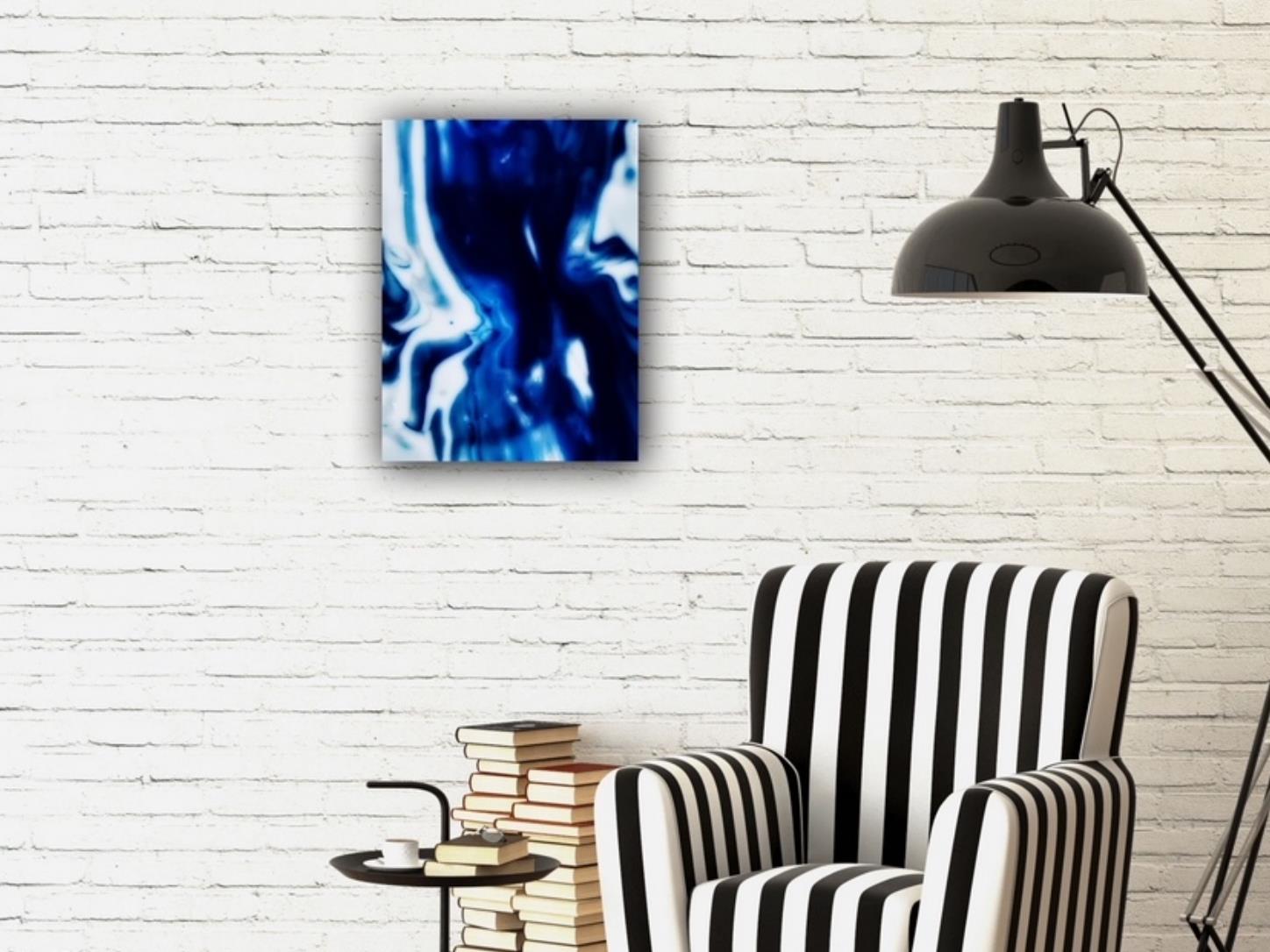 “Blue Tie Dye” started as an art project by soaking cloth in blue dyes. Now tweaked with digital effects, these blurs of blue are cool and soft on a bed of white.