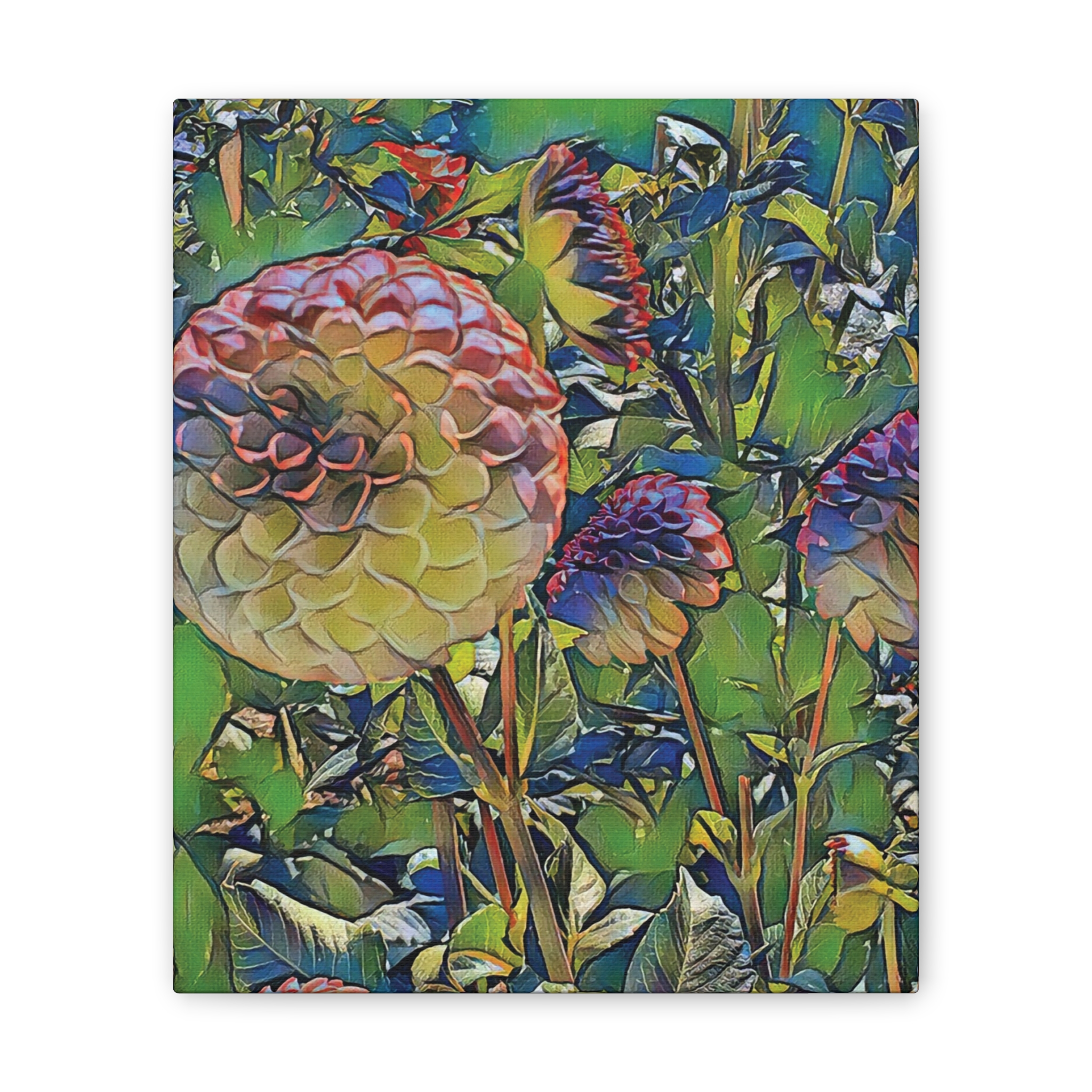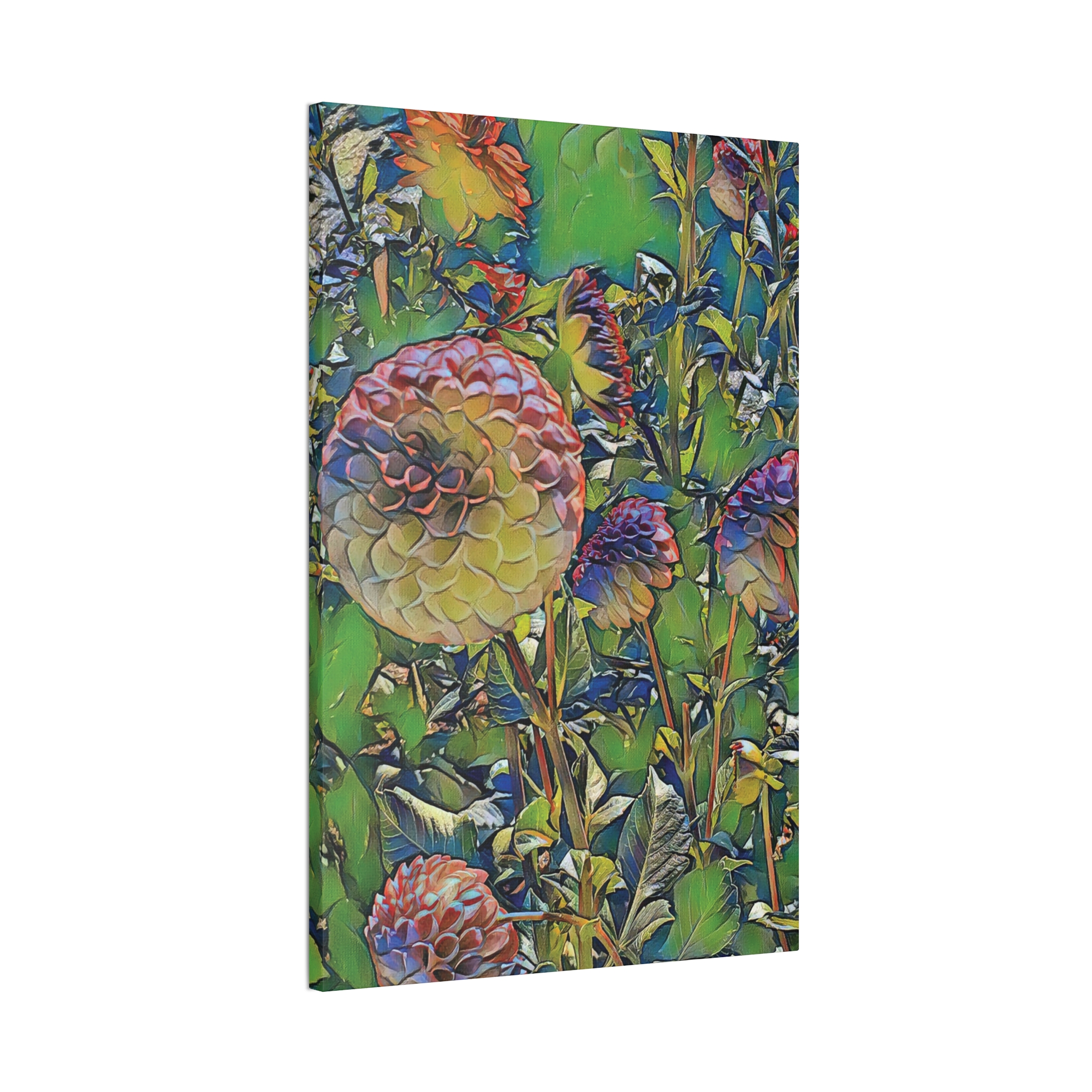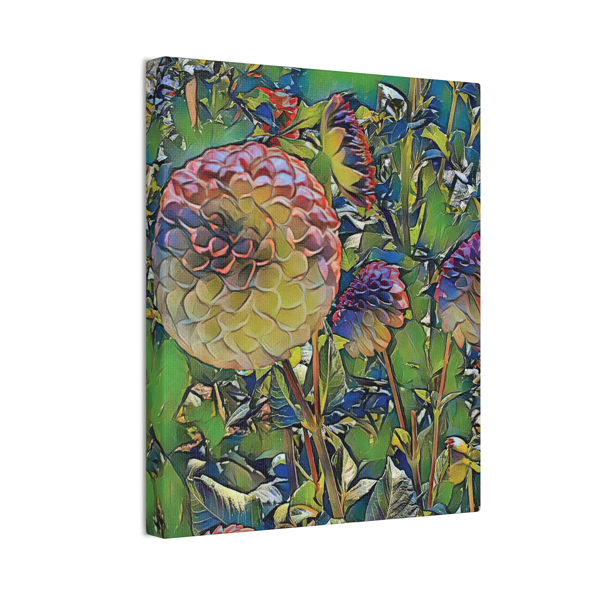 Lush, painterly blossoms come alive on a deep-stretched canvas that feels like a window into a secret garden. The vibrant, saturated colors and soft, layered brushwork draw you in — petals folding like paper lanterns, stems weaving through a field of green. Hung on a living-room wall or tucked into a cozy reading nook, this canvas brings a calm, contemplative energy: the hush of early morning light and the slow, satisfying breath of nature. It’s for people who collect color, who linger over details, and who want their walls to tell a quiet, floral story during seasonal gatherings or when guests drop by.