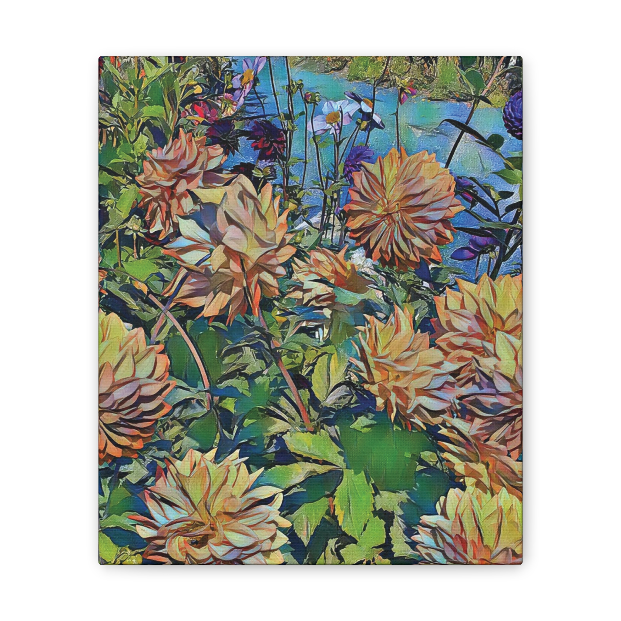 A vibrant stretched canvas that brings a lively garden into your home. Rich, painterly blooms and layered foliage leap from the surface in warm golds, greens, and sky blues. The deep-stretched pine frame gives the piece presence on any wall while the saturated dye printing keeps colors vivid from every angle. Hang it in a sunlit corner to brighten mornings, place it above a sofa to anchor a living room, or cluster several sizes for a collected-gallery feel. The textured polyester surface adds a subtly modern, almost oil-like finish that reads like a hand-painted work from across the room.