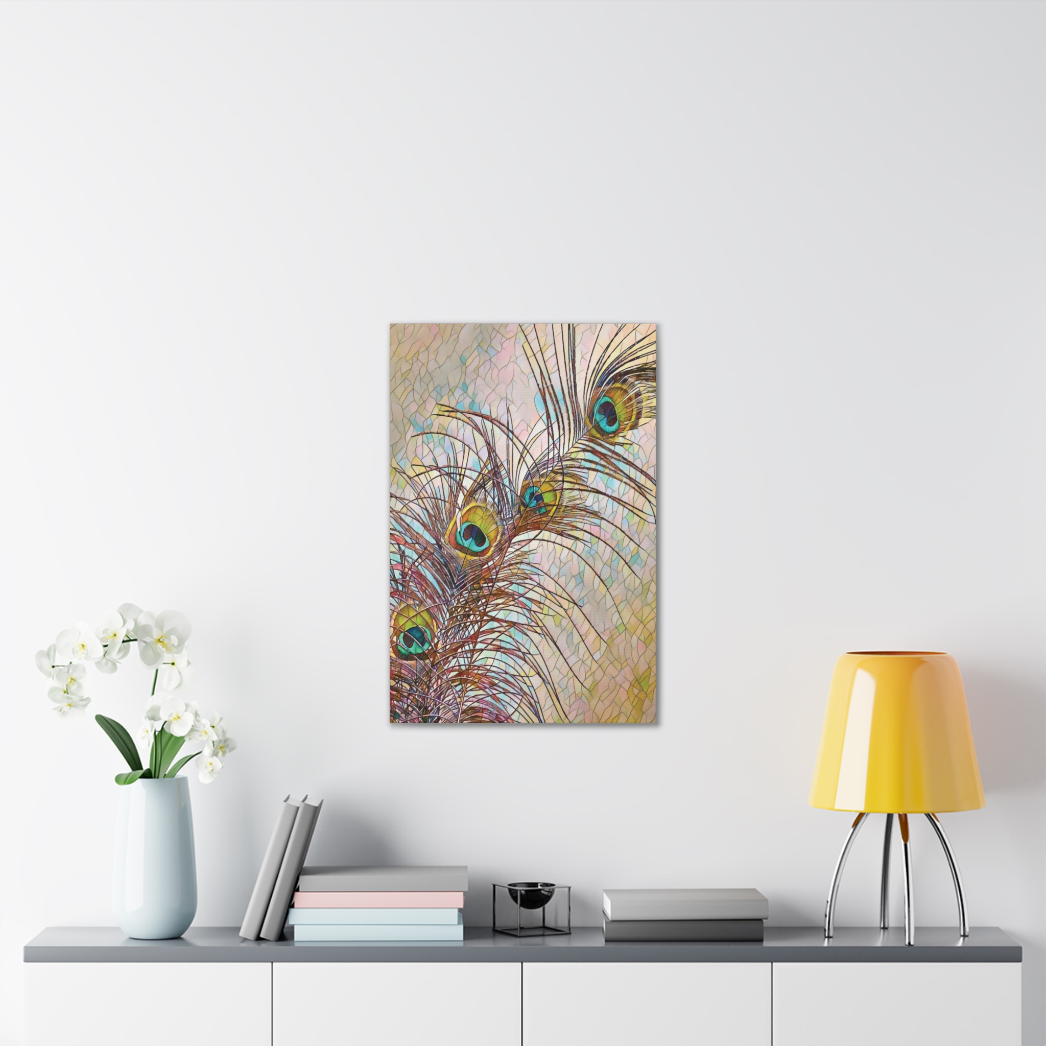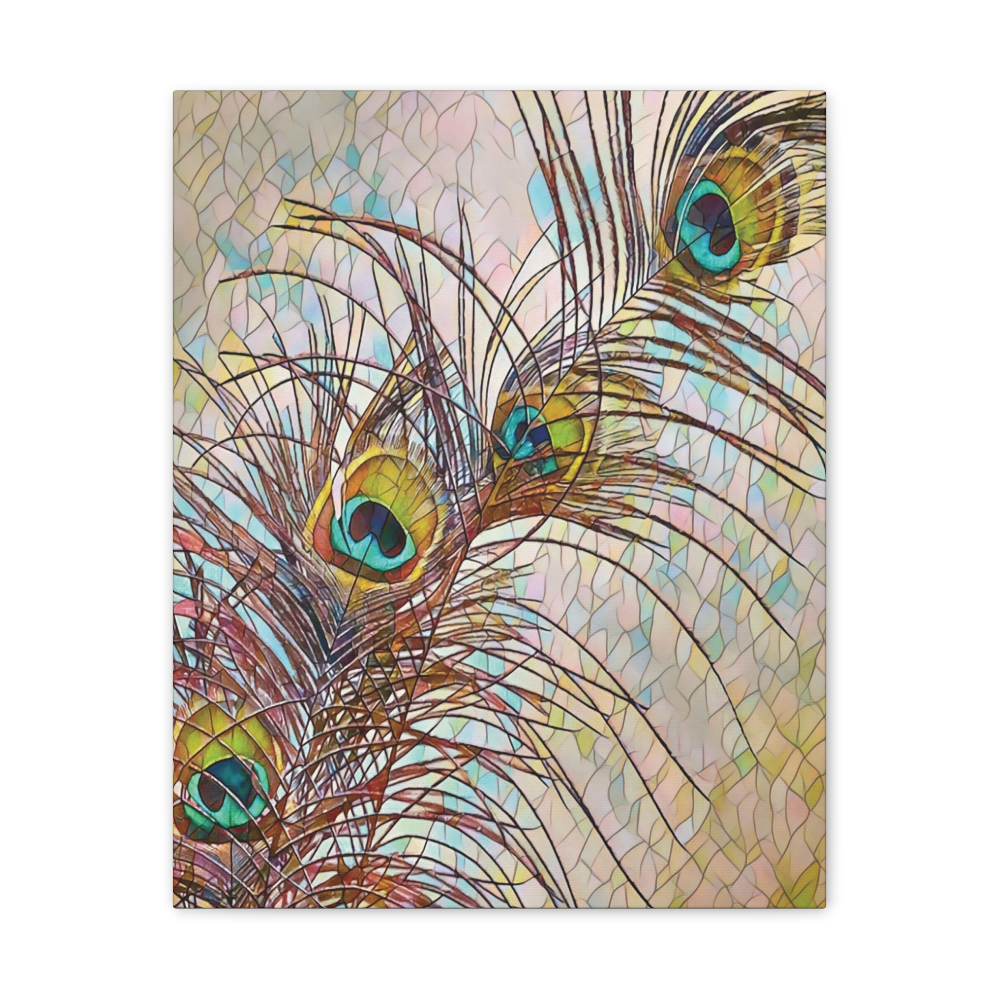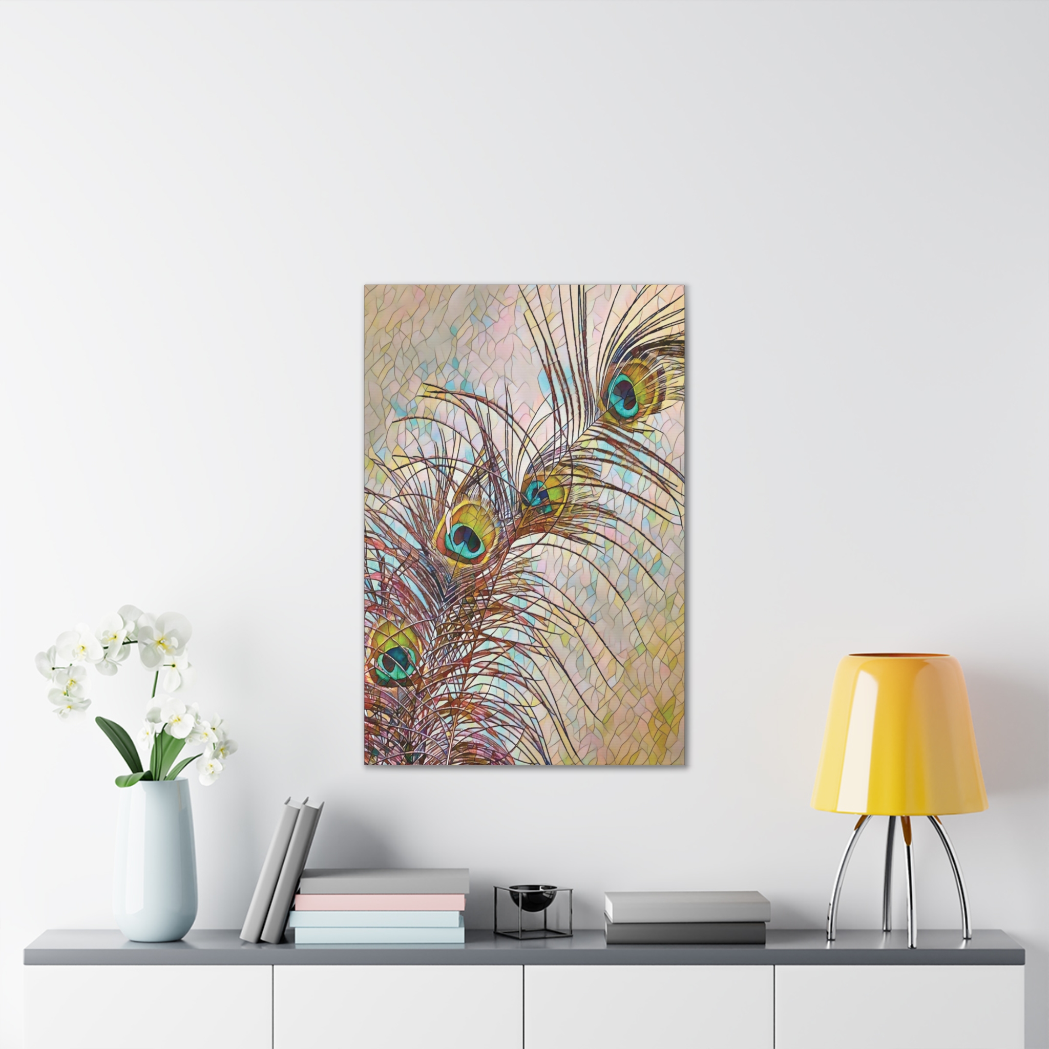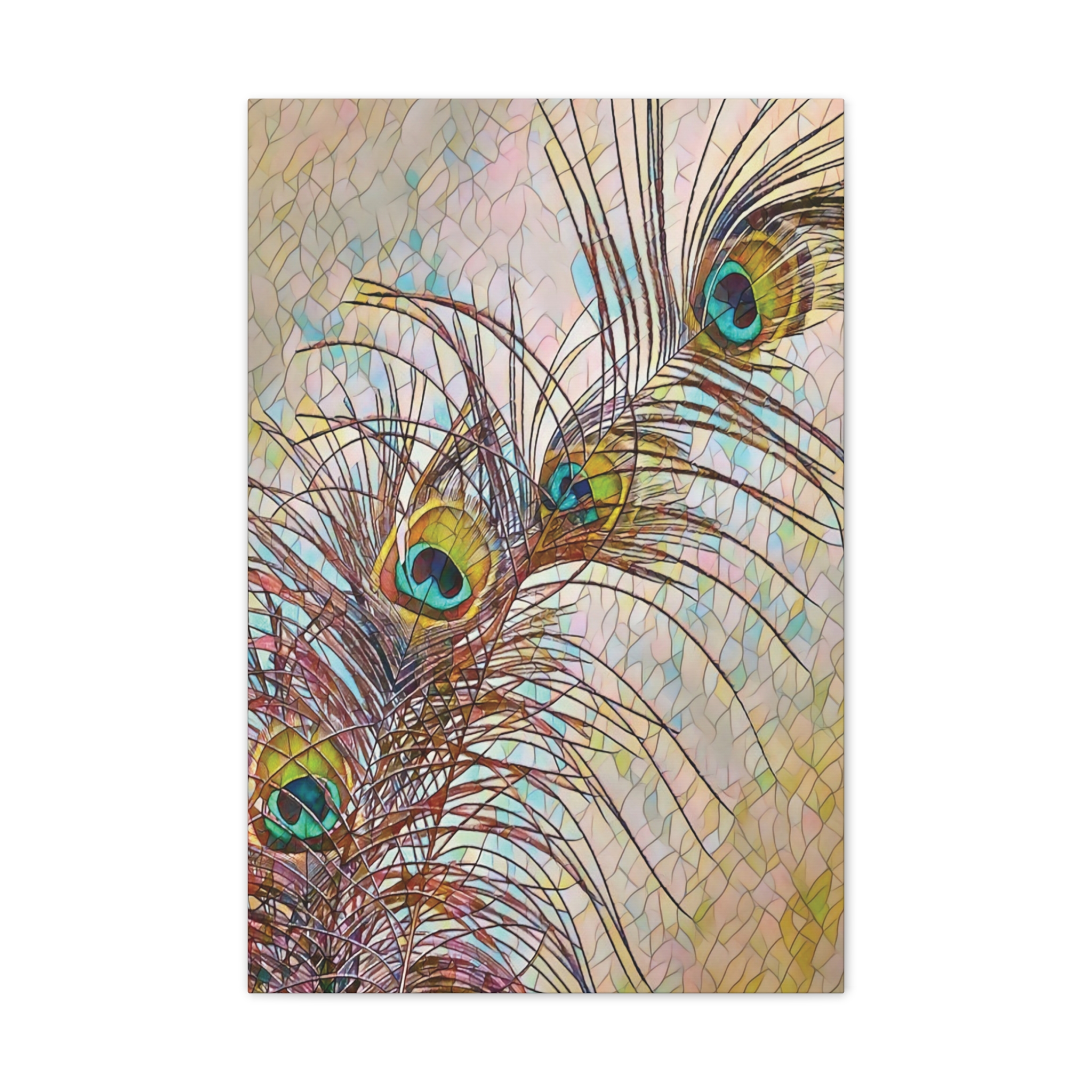 A gallery-quality stretched canvas that brings a whisper of nature and fine-art flair to your walls. Lightweight yet sturdy, the pinewood stretcher and vibrant polyester canvas deliver crisp, jewel-toned peacock feathers that catch light and draw the eye. Hang it vertically in a sunlit corner, lean it against a mantel, or create a layered wall of mixed formats — the rich turquoise and gold highlights add a calm, elegant focal point that feels collected over time. Subtle texture from the canvas and slight edge wrap give the piece depth; mounting hardware is included so it arrives ready to display.