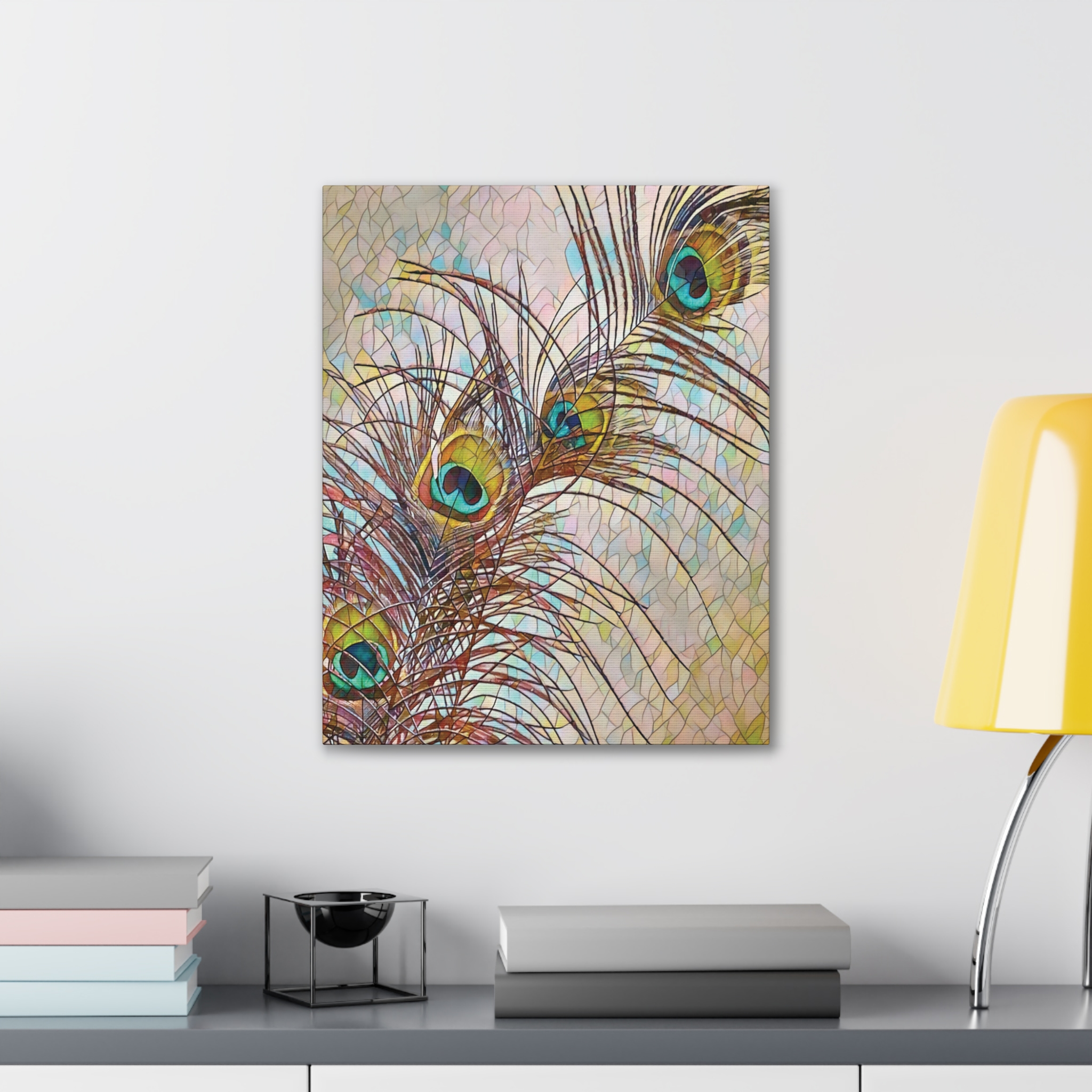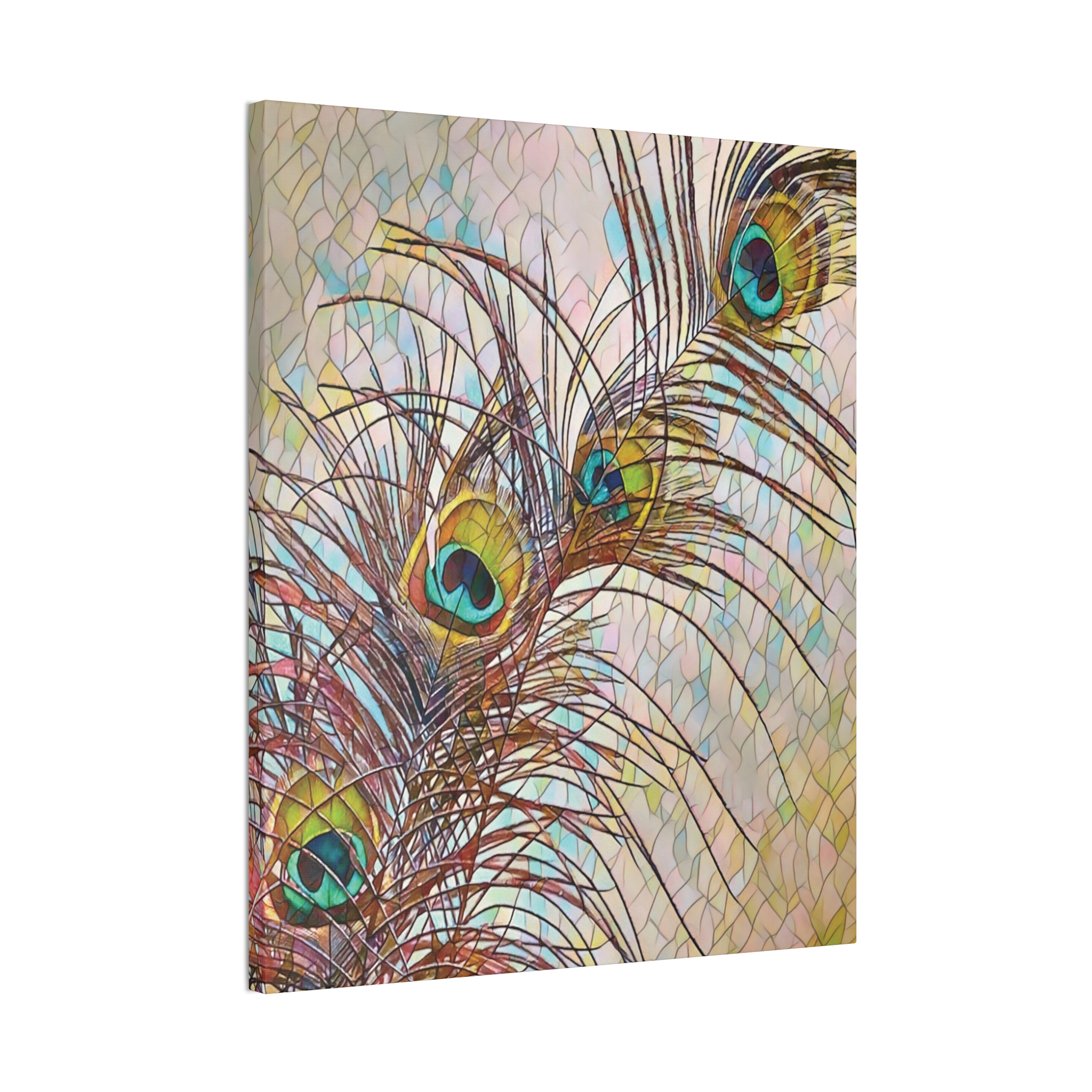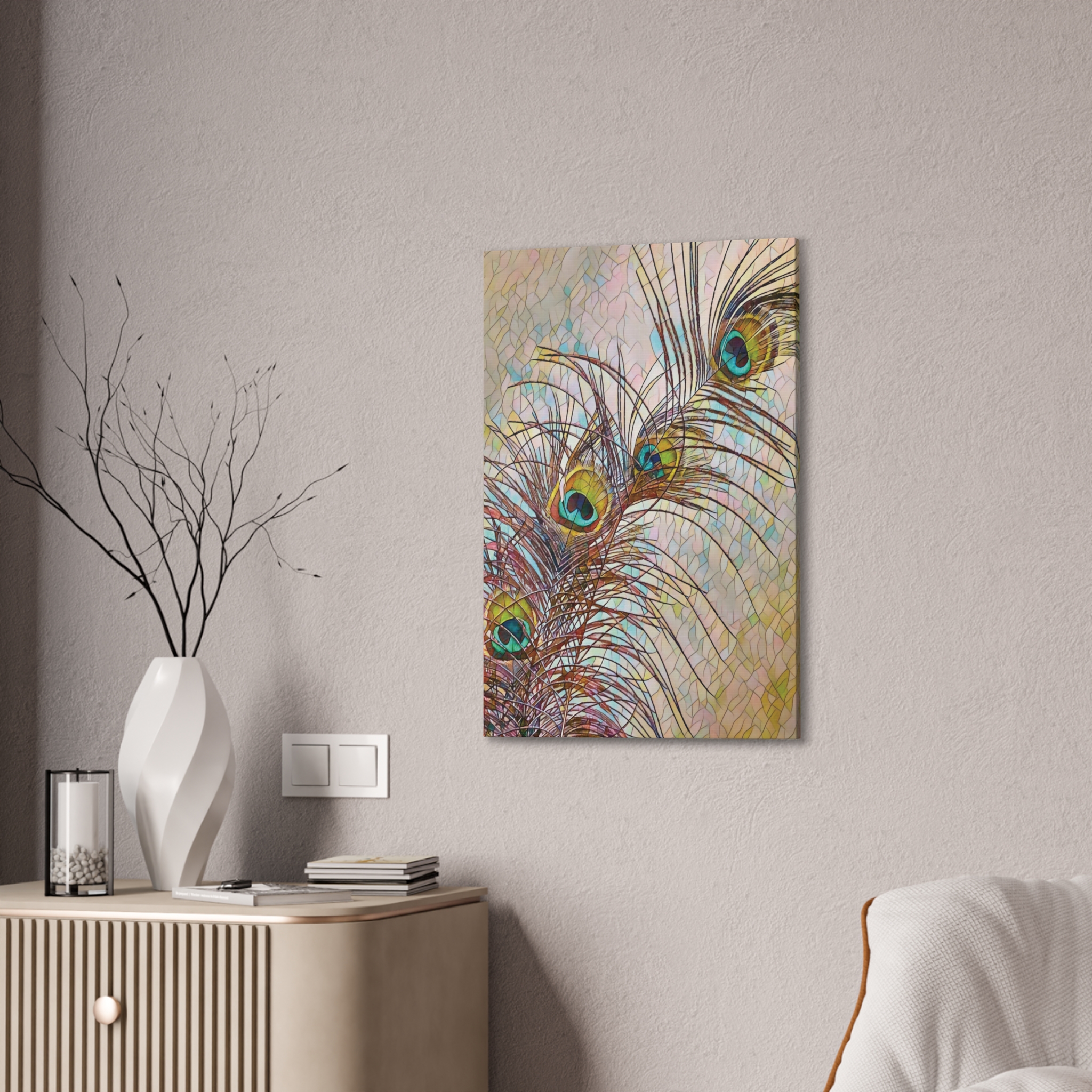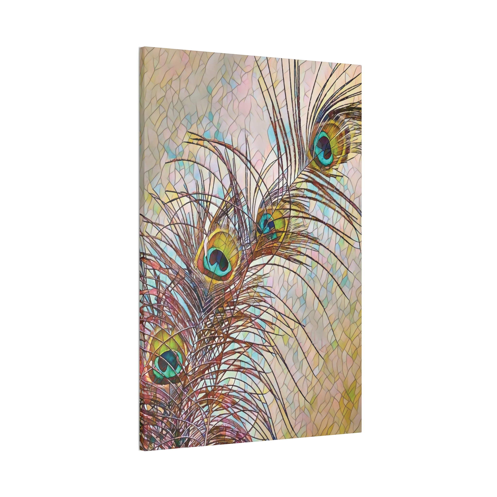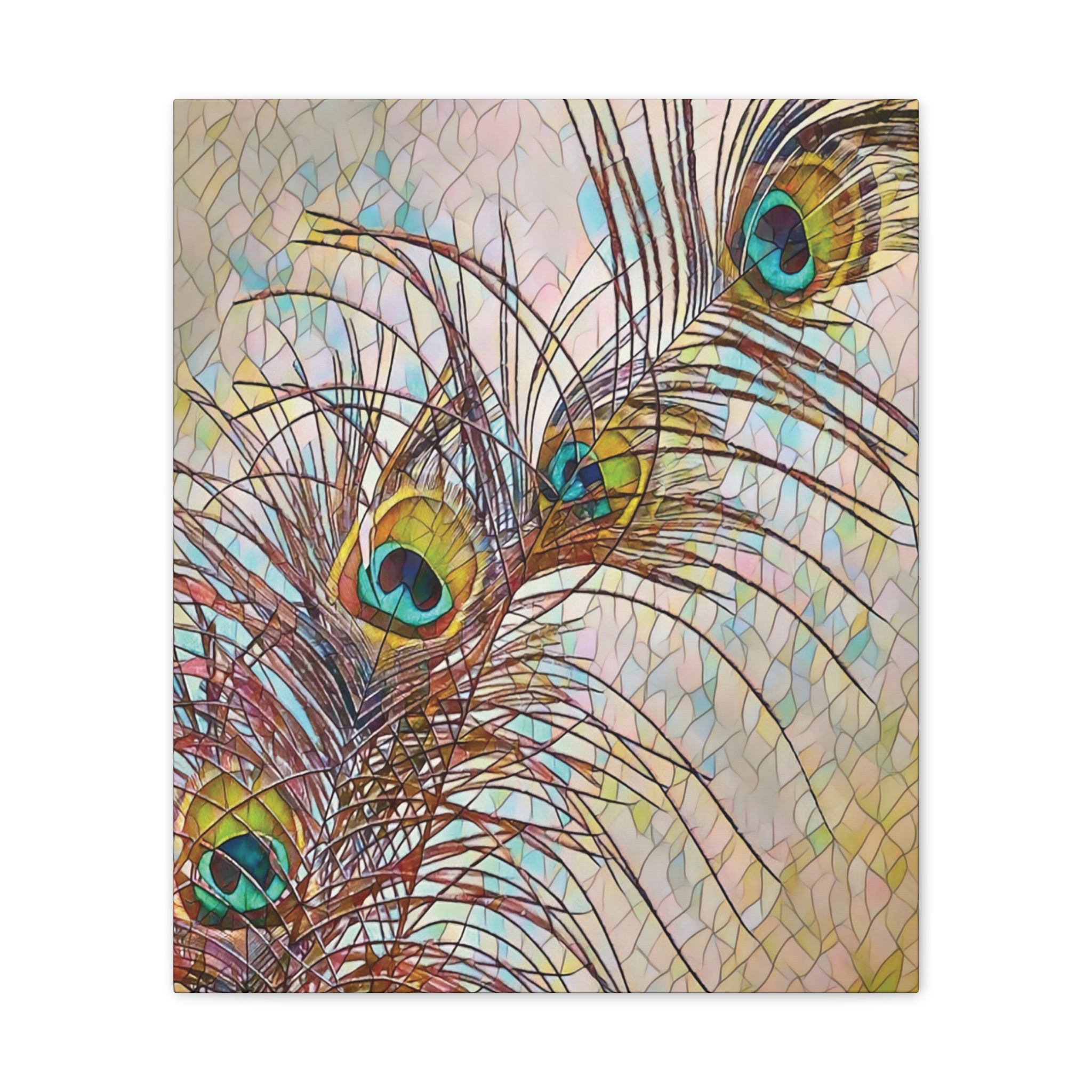 A gallery-quality stretched canvas that brings a whisper of nature and fine-art flair to your walls. Lightweight yet sturdy, the pinewood stretcher and vibrant polyester canvas deliver crisp, jewel-toned peacock feathers that catch light and draw the eye. Hang it vertically in a sunlit corner, lean it against a mantel, or create a layered wall of mixed formats — the rich turquoise and gold highlights add a calm, elegant focal point that feels collected over time. Subtle texture from the canvas and slight edge wrap give the piece depth; mounting hardware is included so it arrives ready to display.