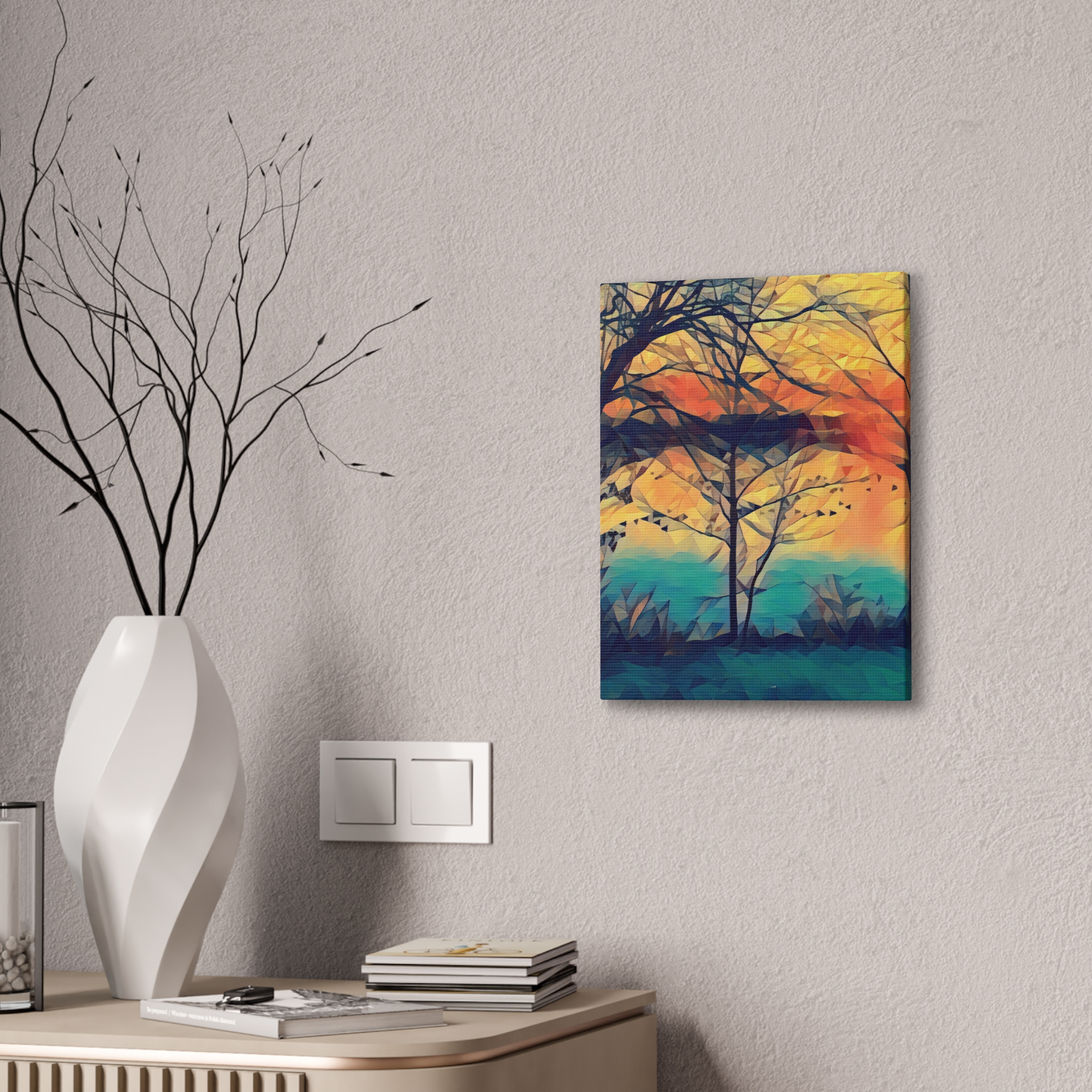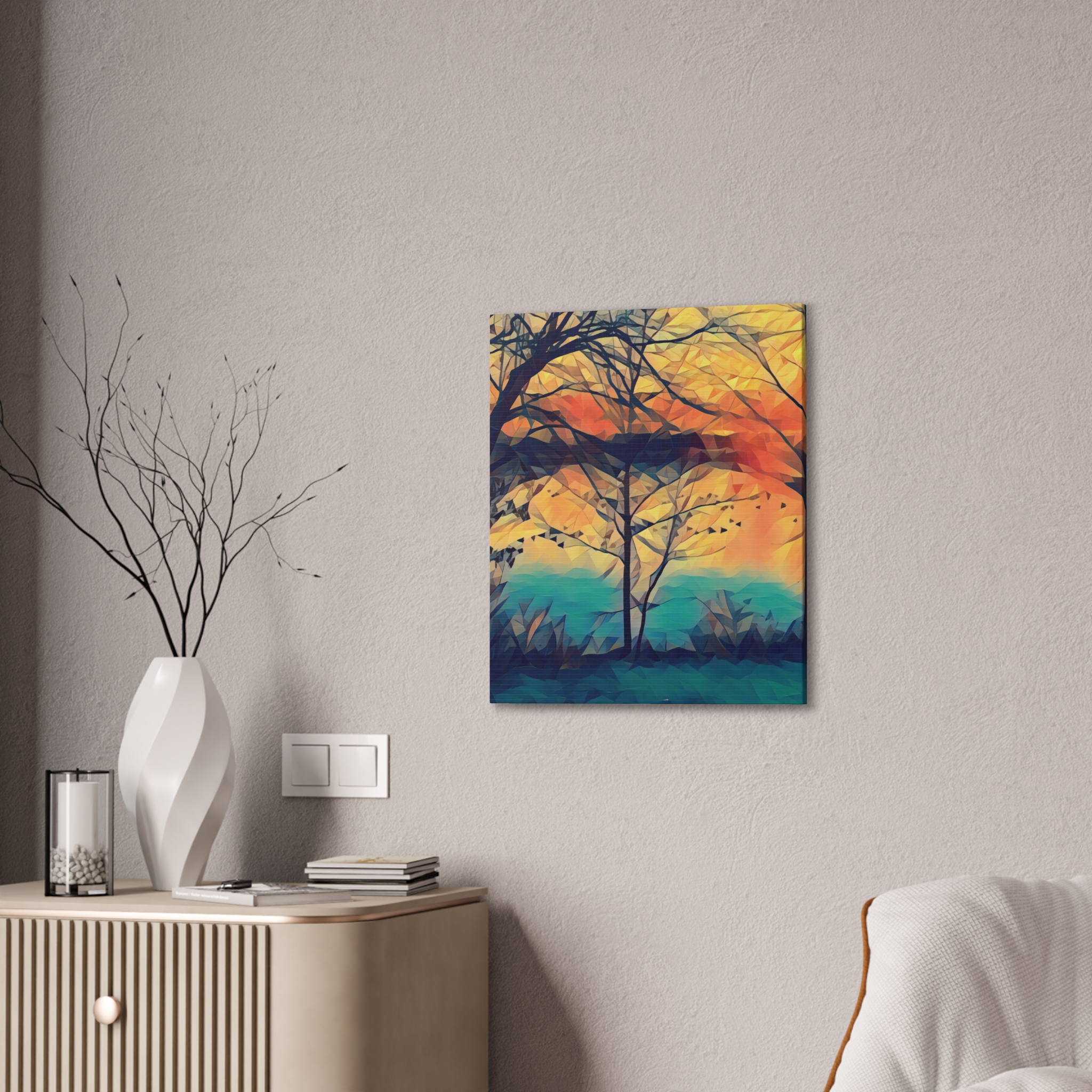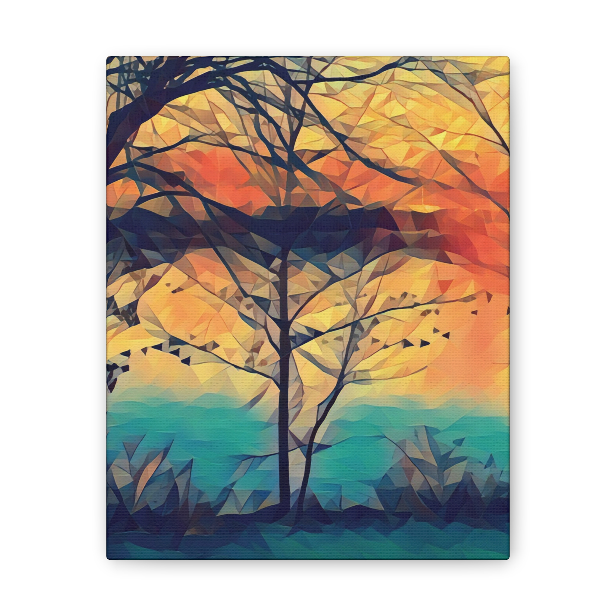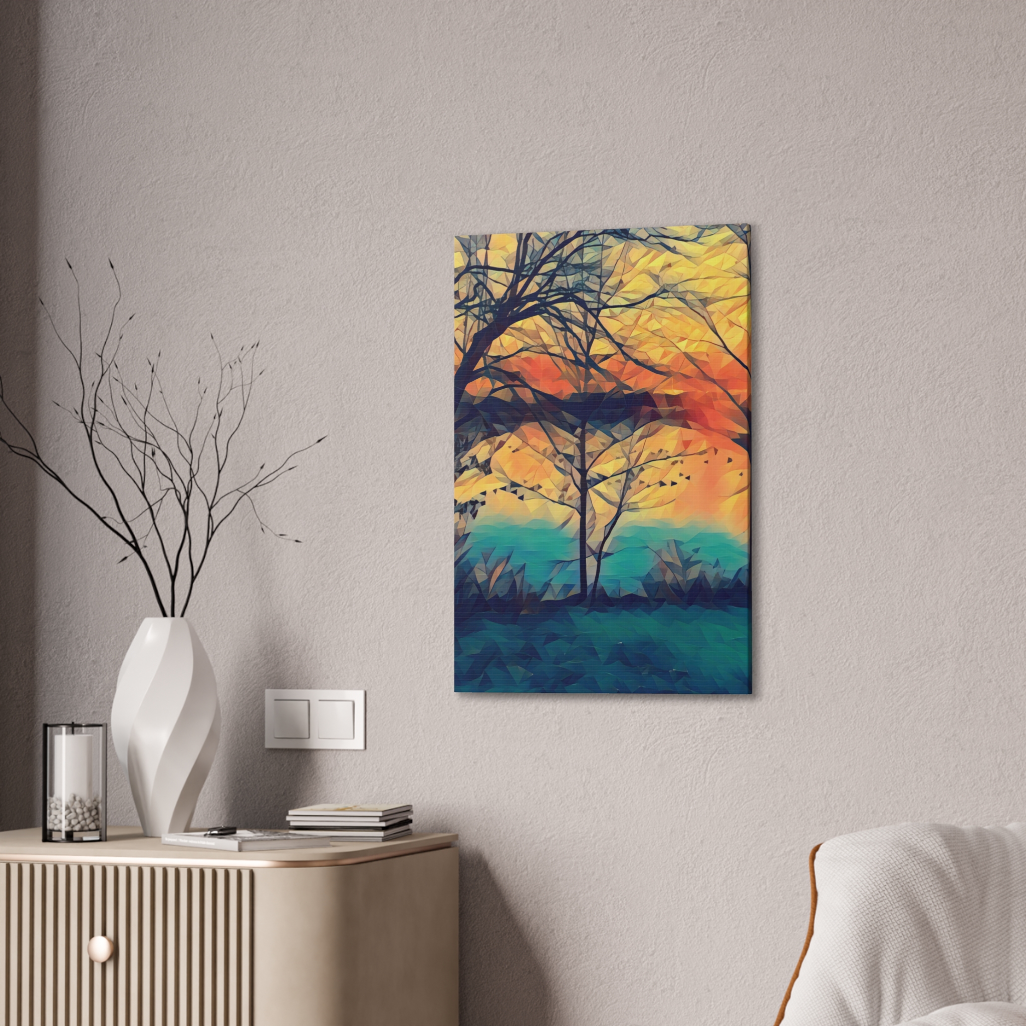 A gallery-quality stretched canvas that brings a warm, painterly landscape into your space. Printed on heavy-weight polyester for vivid, saturated color, the image wraps around a 0.75″ pine stretcher for a clean, floating look on the wall. The composition’s layered sunset tones and soft geometric brushwork create a calm, reflective mood — the kind that invites you to linger with a cup of coffee and watch light shift through branches. Lightweight yet sturdy, it arrives ready to hang with included mounting hardware and a discreet QR code on the back for care or provenance information.