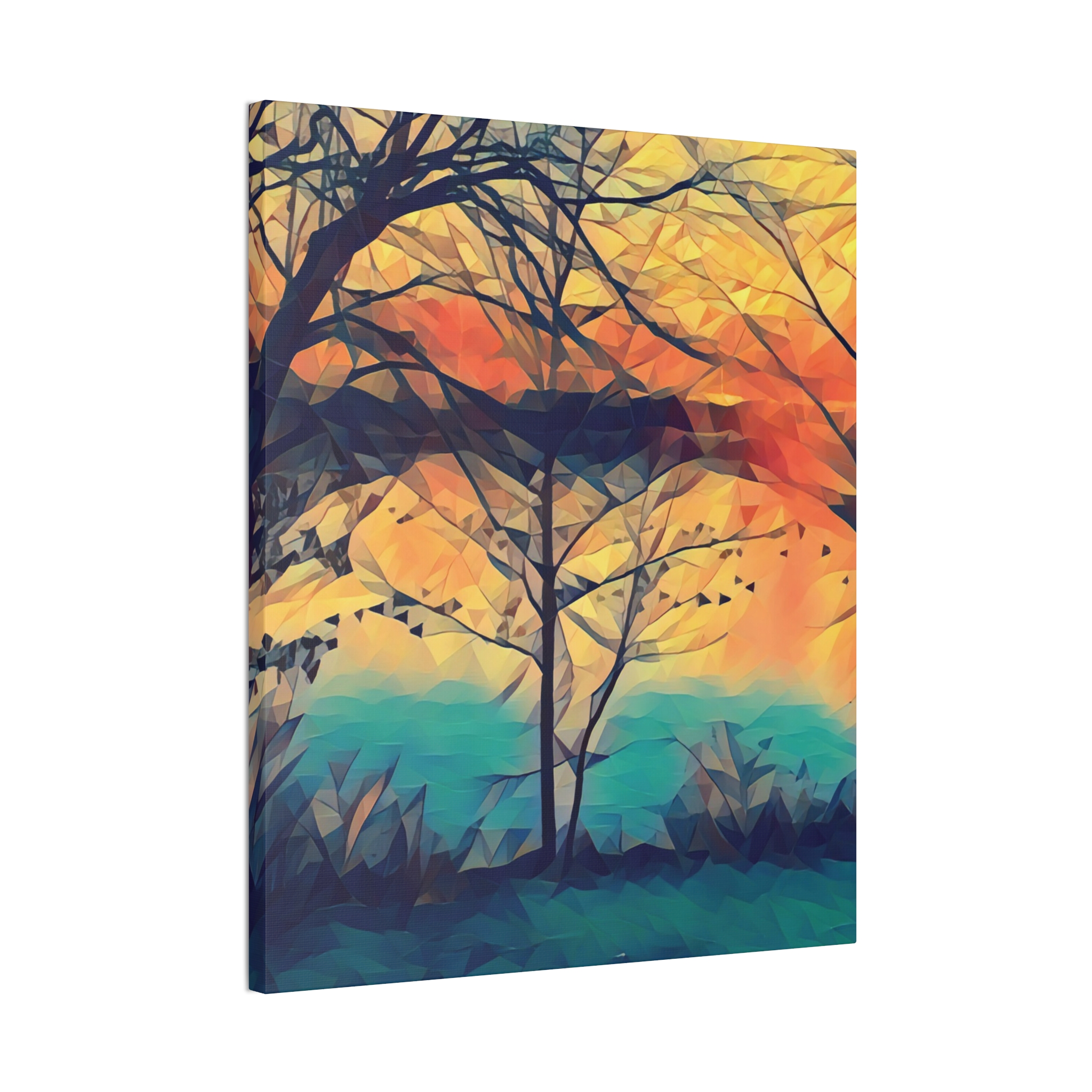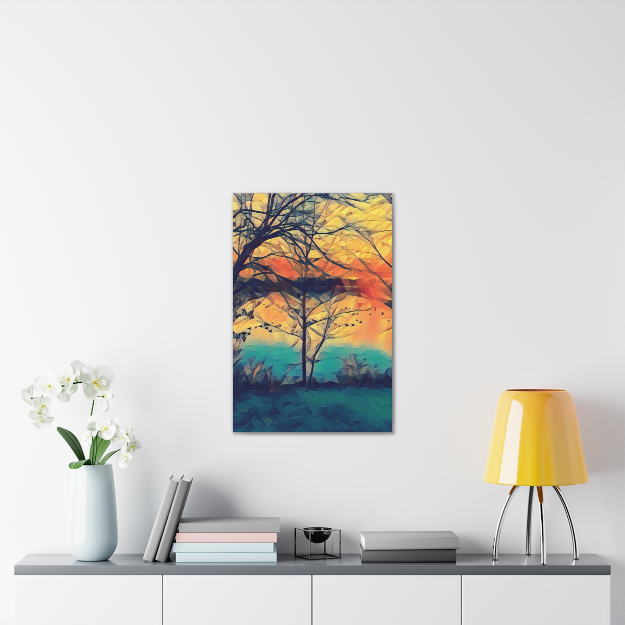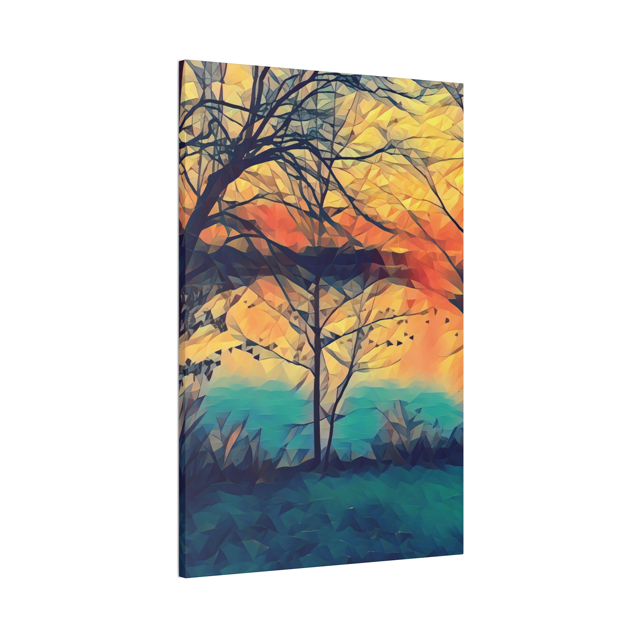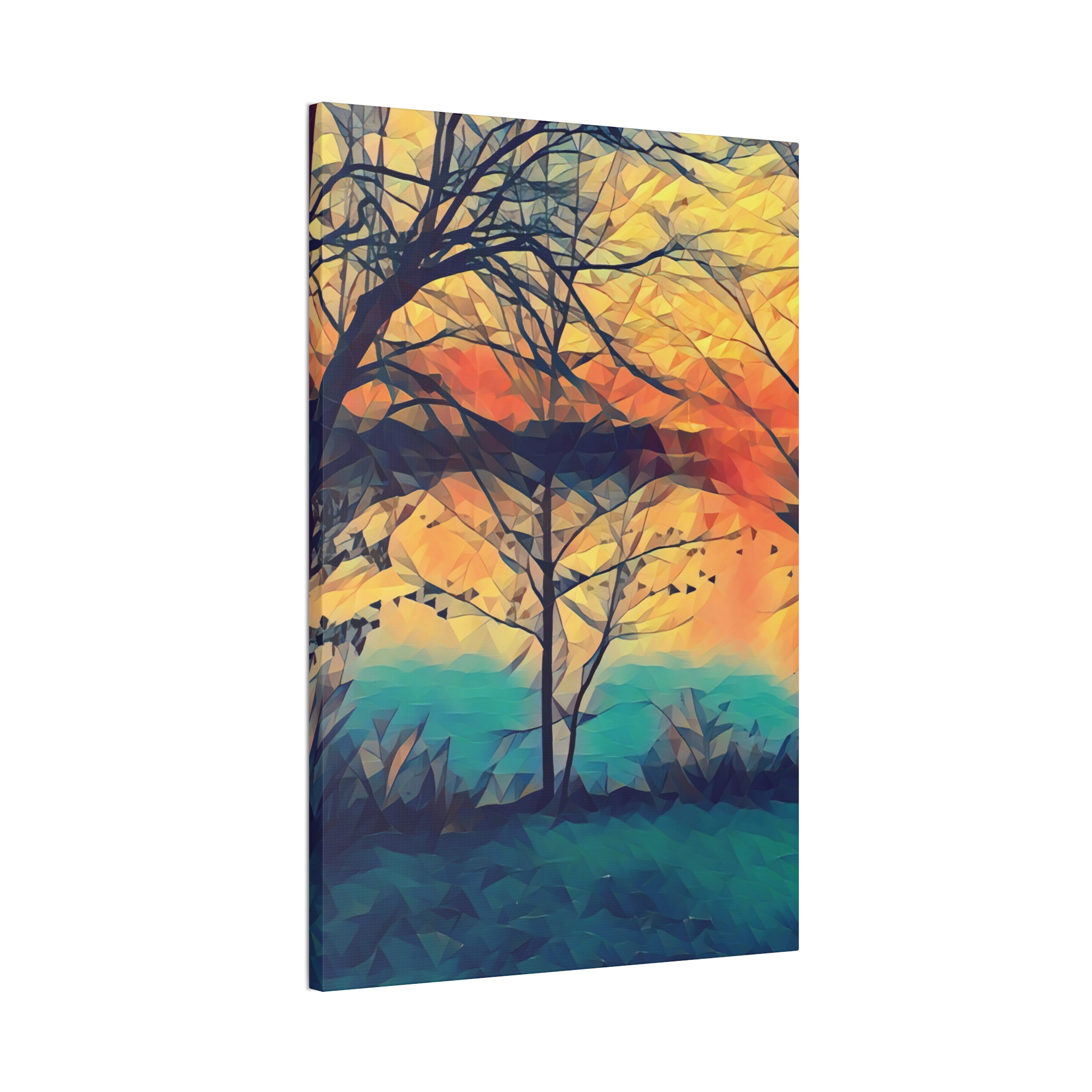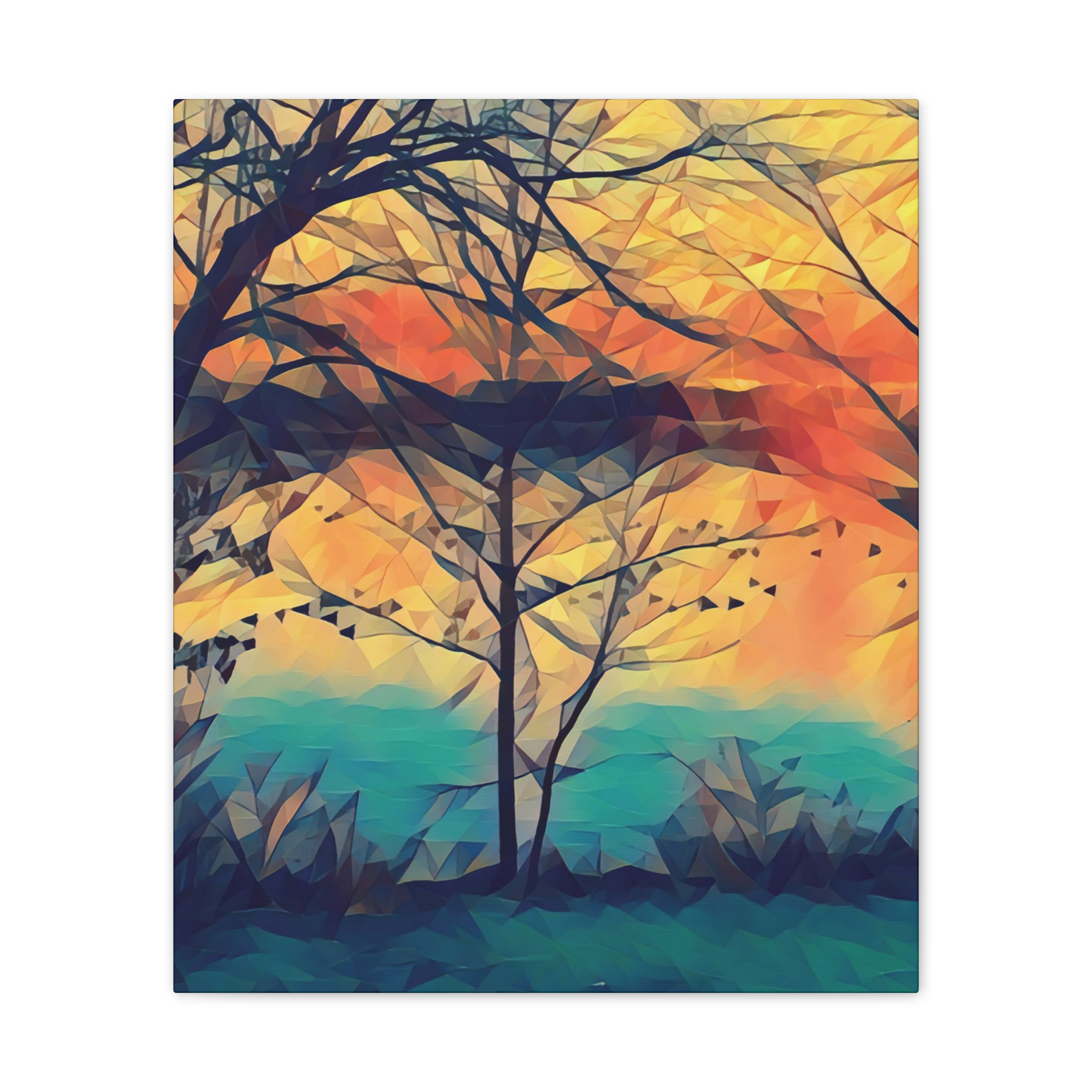 A gallery-quality stretched canvas that brings a warm, painterly landscape into your space. Printed on heavy-weight polyester for vivid, saturated color, the image wraps around a 0.75″ pine stretcher for a clean, floating look on the wall. The composition’s layered sunset tones and soft geometric brushwork create a calm, reflective mood — the kind that invites you to linger with a cup of coffee and watch light shift through branches. Lightweight yet sturdy, it arrives ready to hang with included mounting hardware and a discreet QR code on the back for care or provenance information.