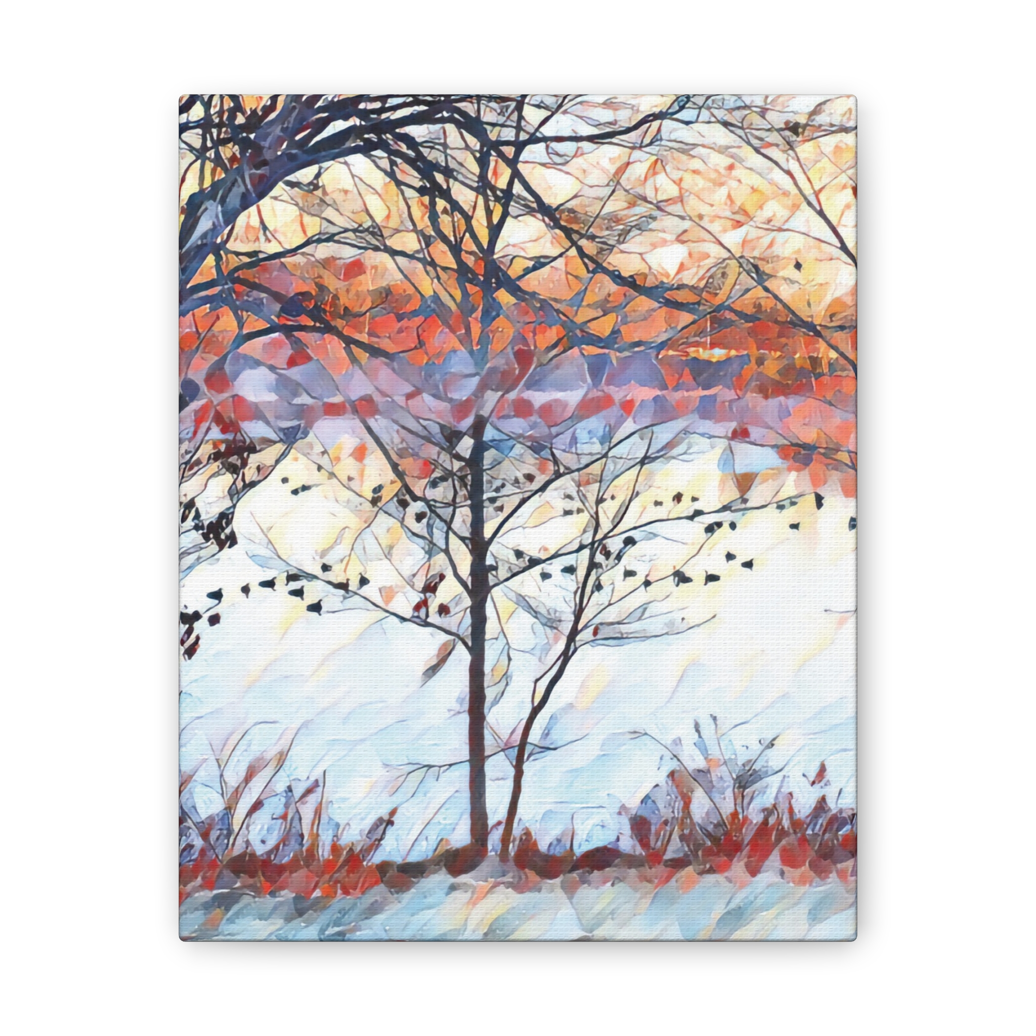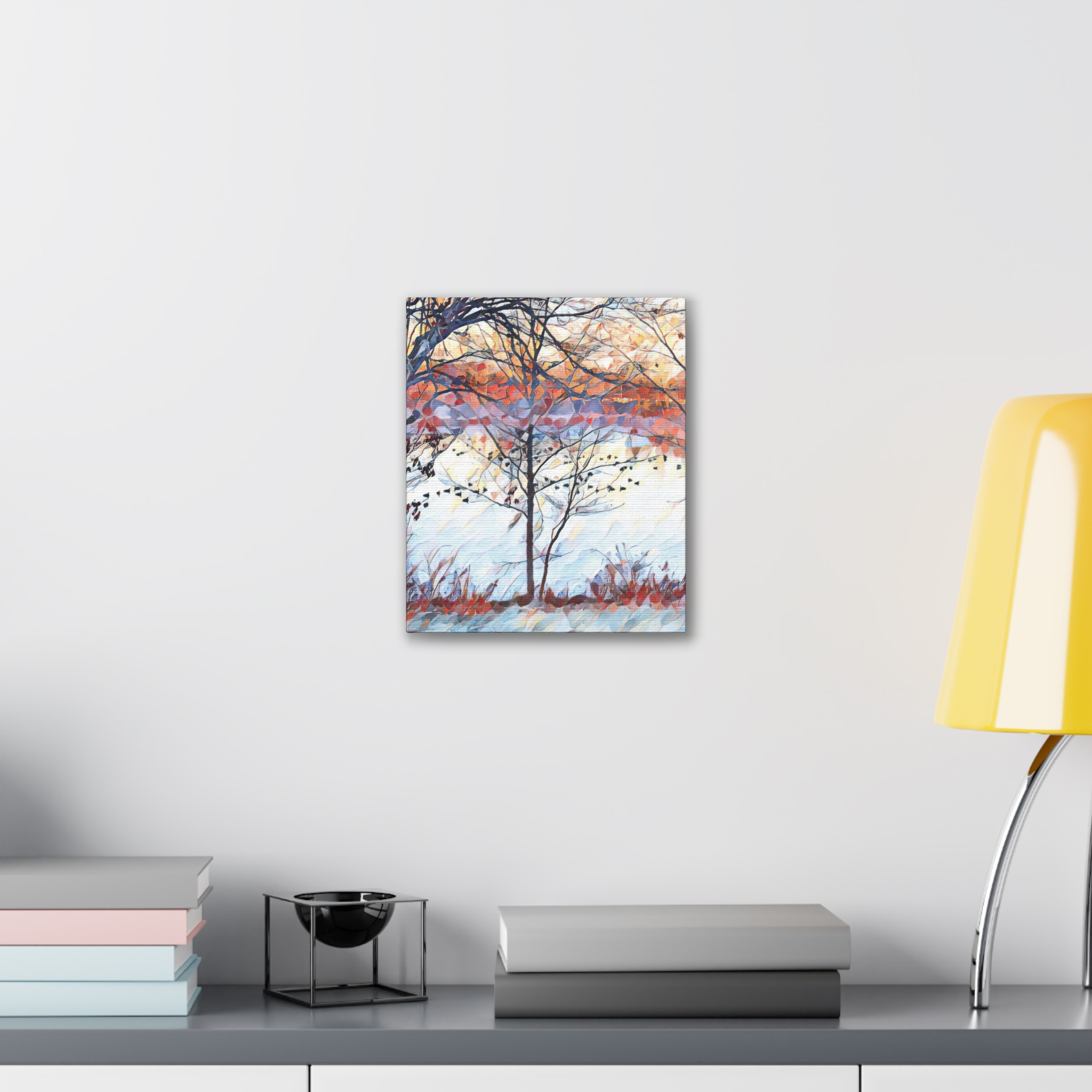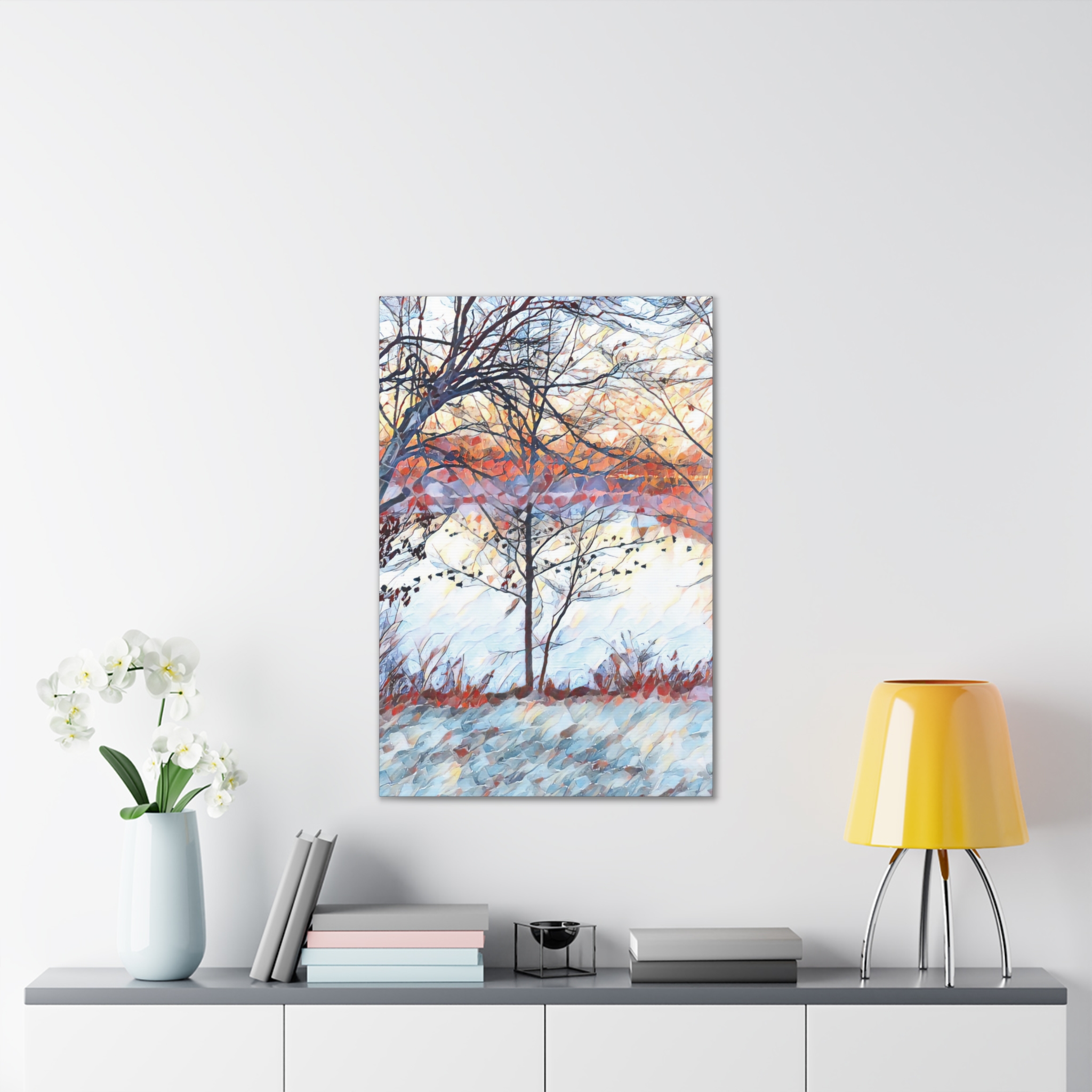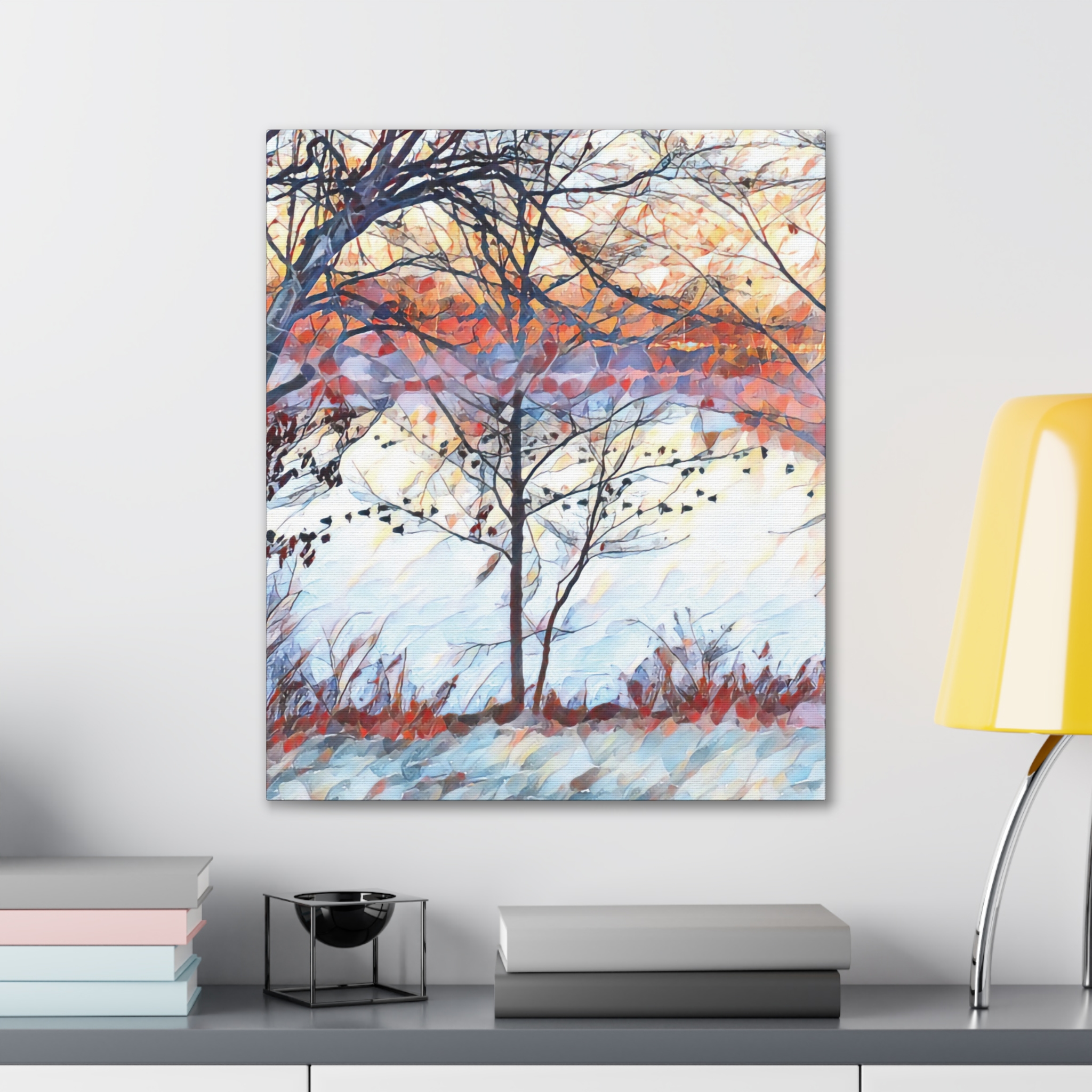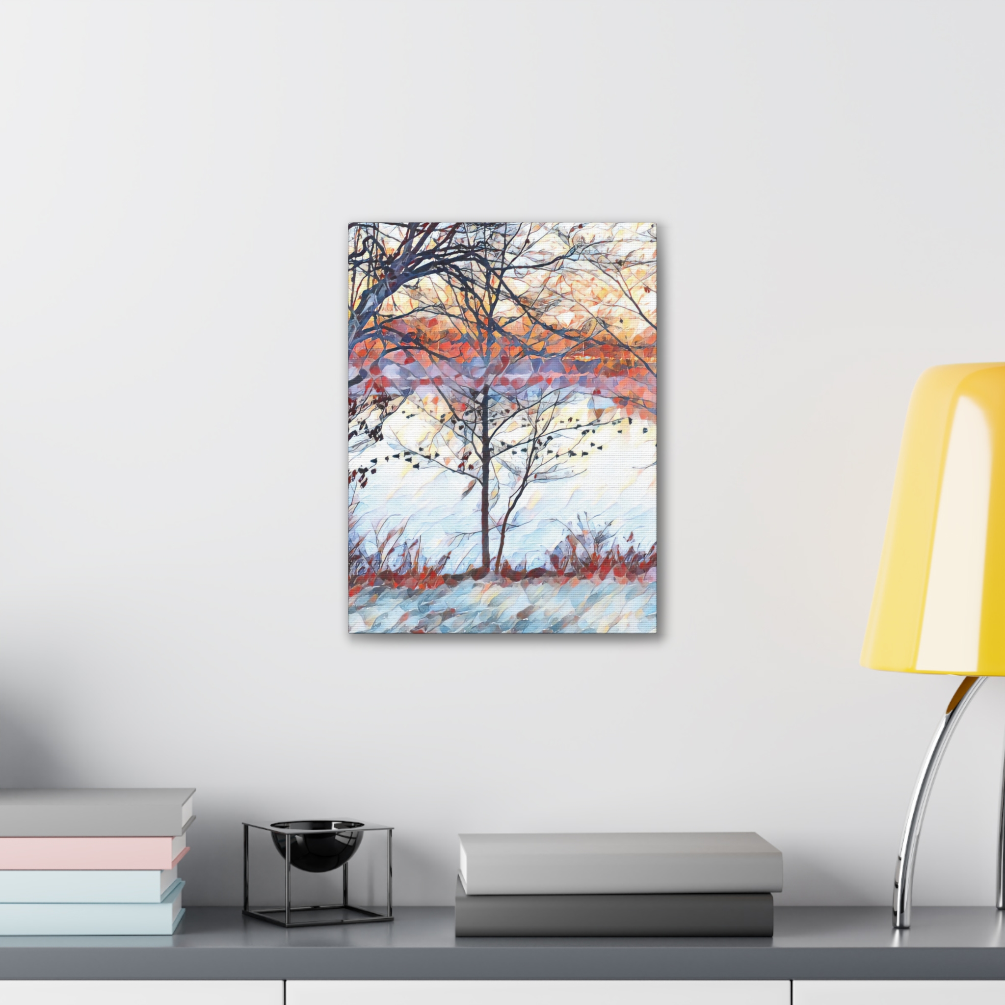A stretched canvas print that brings a soft, painterly winter landscape into your room. Delicate branches and warm sunset tones blend across a textured polyester surface, giving the scene depth and movement from every angle. The slim 0.75″ pine frame keeps the piece light on the wall while preserving the artwork’s edges, so the view reads beautifully whether hung alone or layered with other pieces. Mounting hardware is included and small QR codes are discreetly printed on the back for authentication and care info.