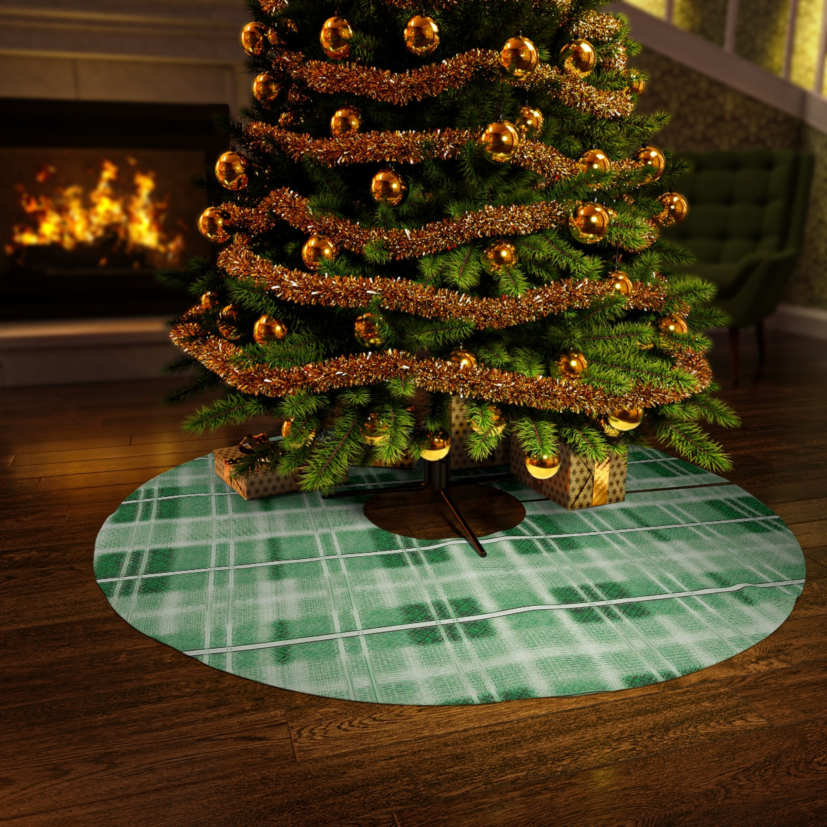 A perfect addition to your Christmas festivities, this tree skirt features a green and white, “Green Plaid” design. Made of soft fleece material, it adds a cozy and warm look to your holiday decor. Spread even more of the holiday cheer by complementing this tree skirt with the “Green Plaid” or “Red Plaid” blankets, pillows, coasters, Christmas stockings, or even items for your holiday kitchen.