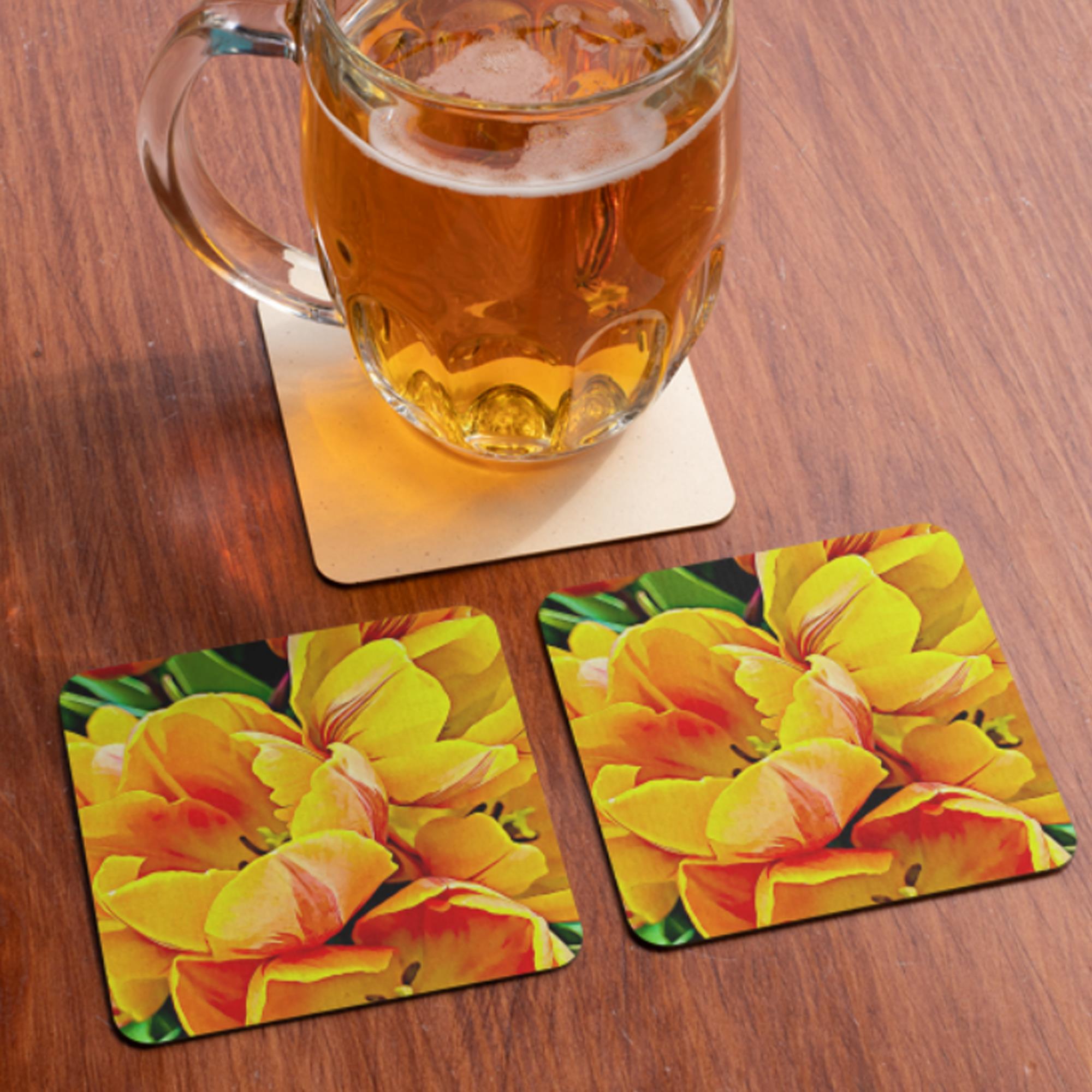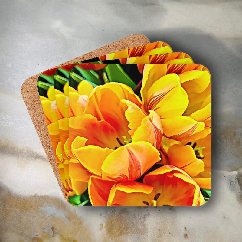 This bright floral artwork is one of three coaster sets from the “Open Petals” Collection. Use these coasters alone, mix and match with the other sets, or complement with other items from the collection.