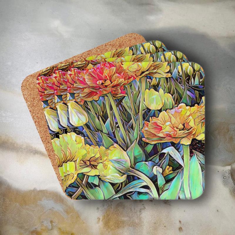 This pretty floral artwork is one of two coaster sets from the “Pastel Garden” Collection. Use these coasters alone, mix and match with the other set, or complement with other items from the collection.