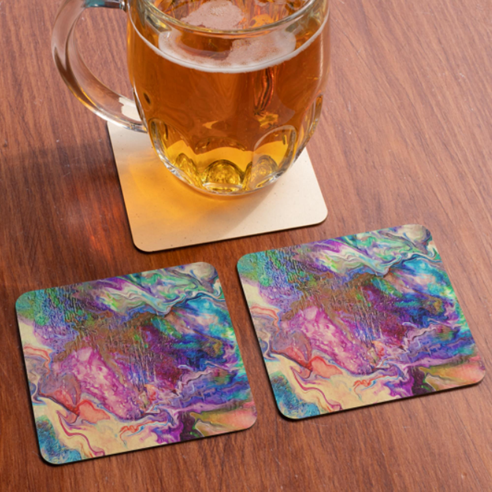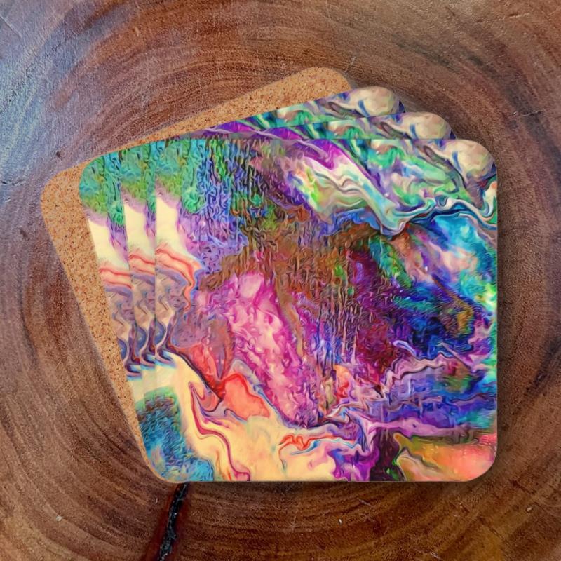 This fun artwork is a great way to freshen up the look of a living room, office, dining room, or anywhere you need to set a drink. Use these coasters alone, or complement with other items from the “Purple Pour” Collection.