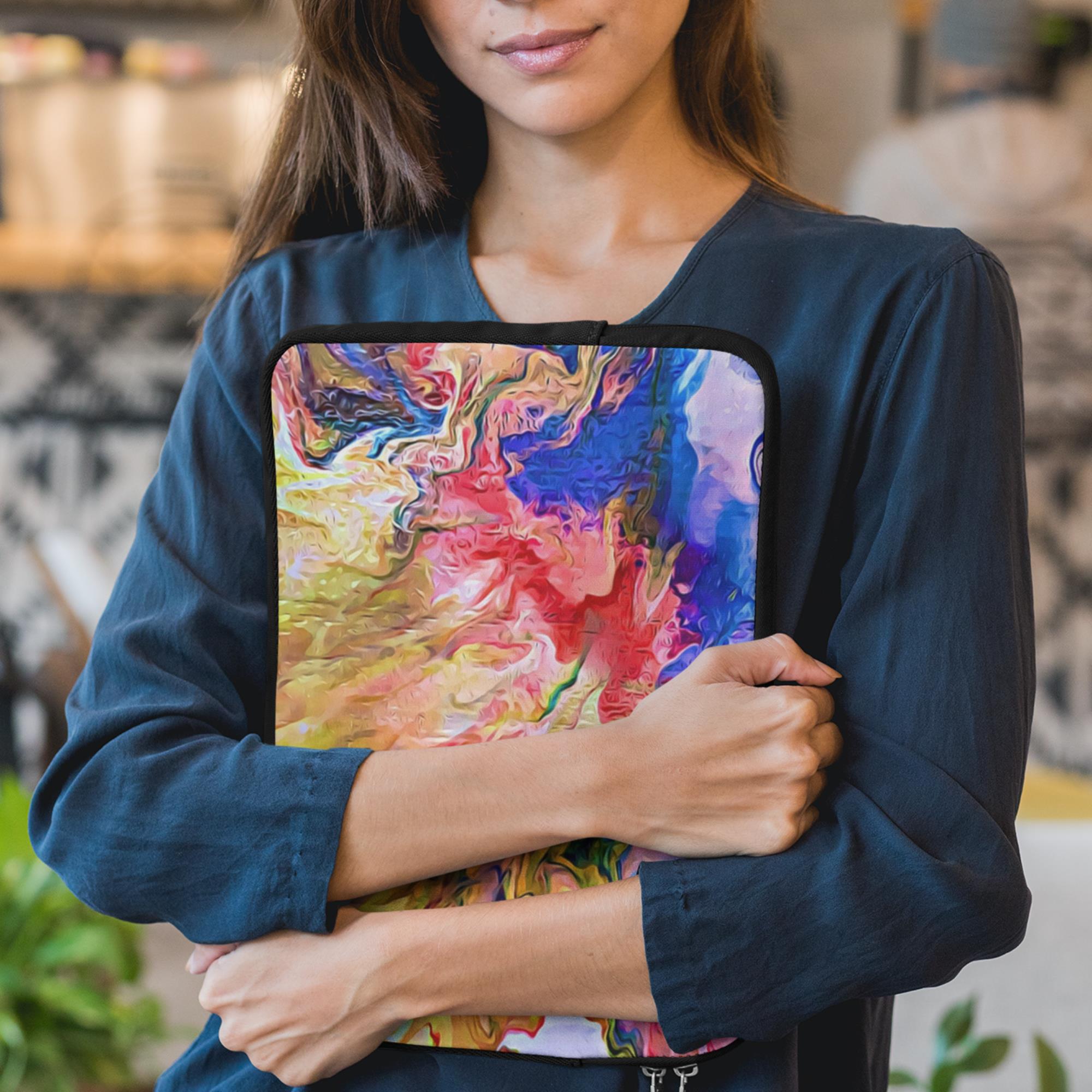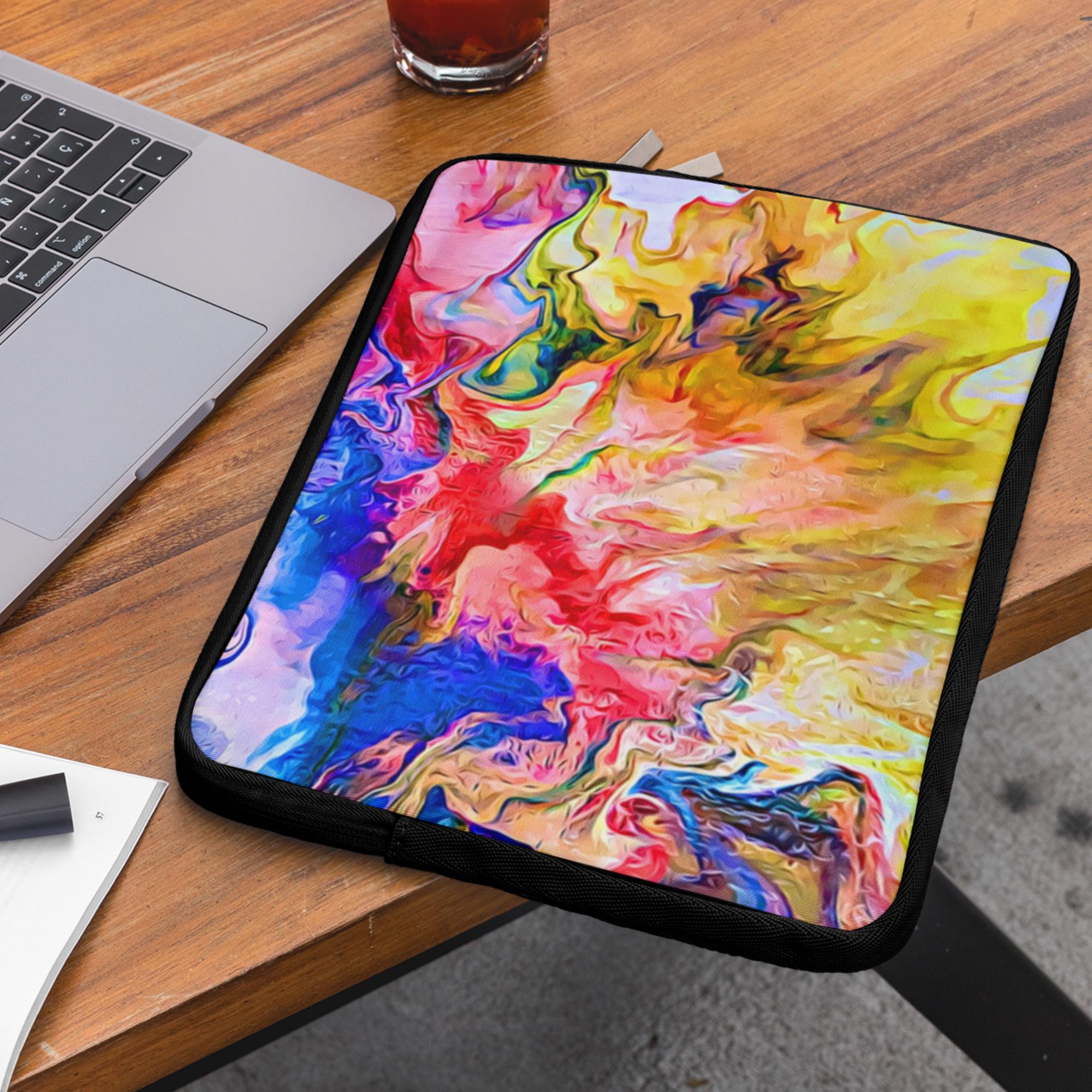 Protect your laptop in style in this lightweight laptop sleeve! To prevent any scratch marks, it contains an internal padded zipper with a full interior lining of faux fur that holds your laptop snug. As for the exterior, it’s made of a material that is resistant to water, oil, and heat, making sure the “Rainbow Pour” artwork continues to look its best.