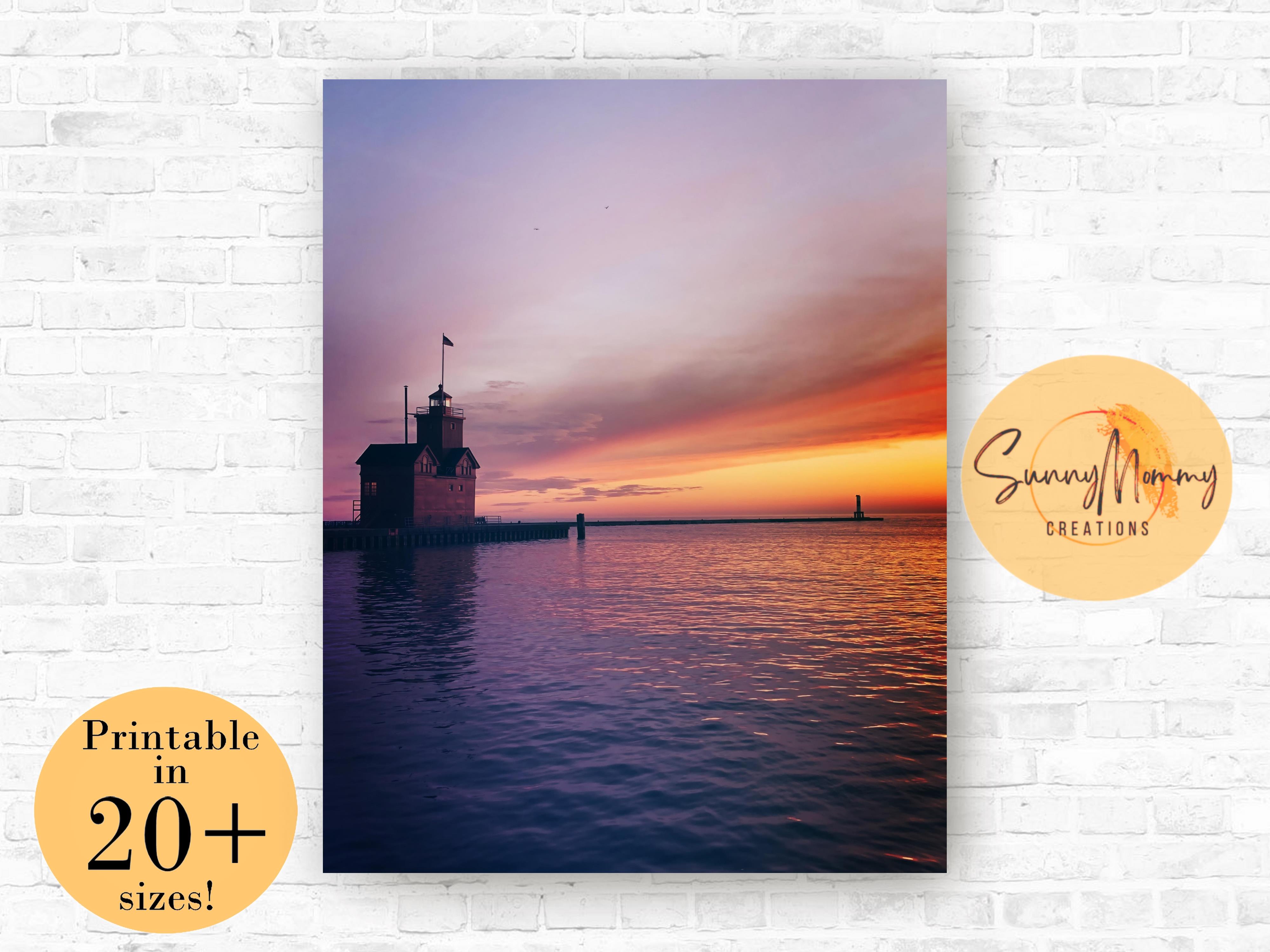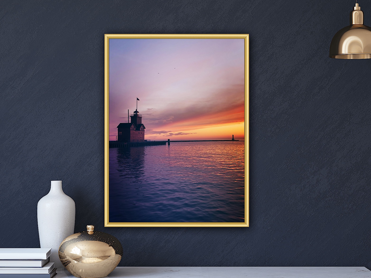 “Lighthouse Purple Night” is one of several sunset pictures captured one beautiful evening along the shore of Lake Michigan. Now with the natural purple hues enhanced, this photo art swirls and ripples with the shades of this lovely sunset.