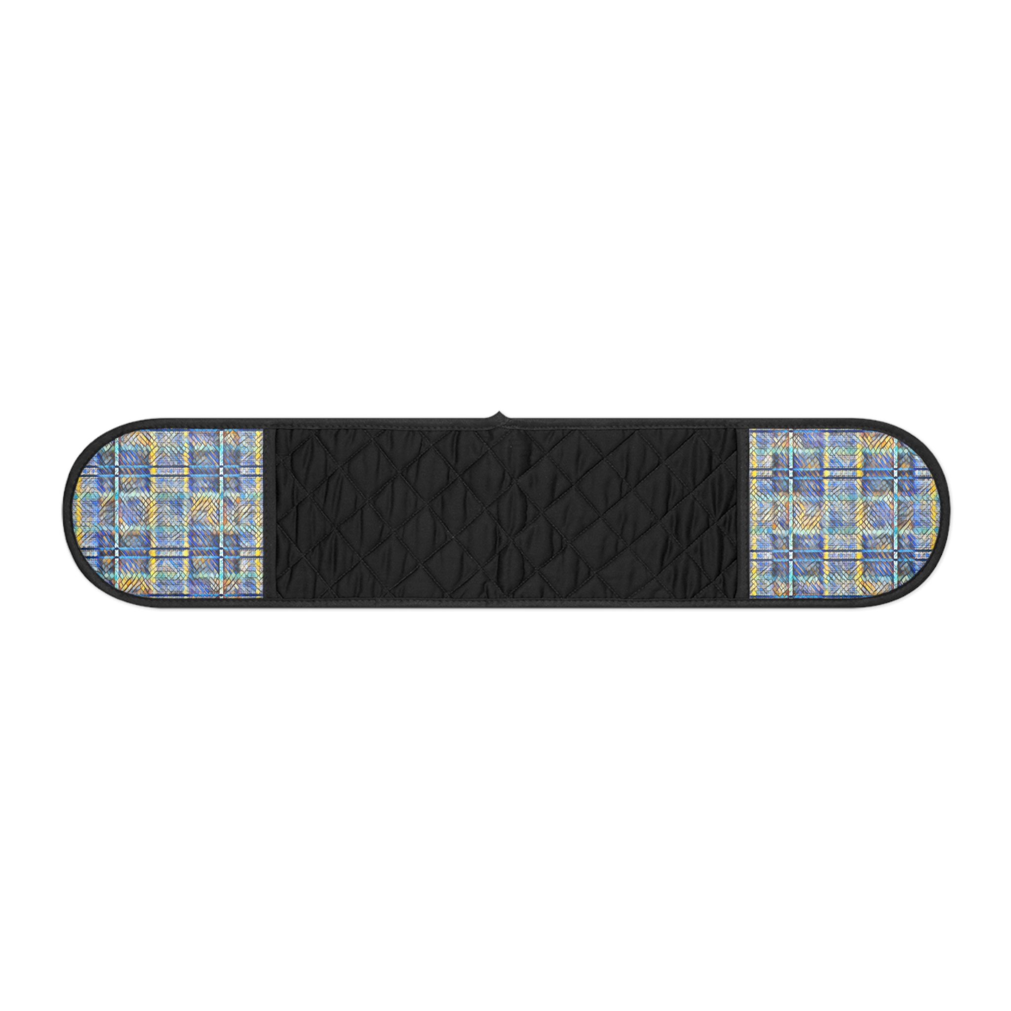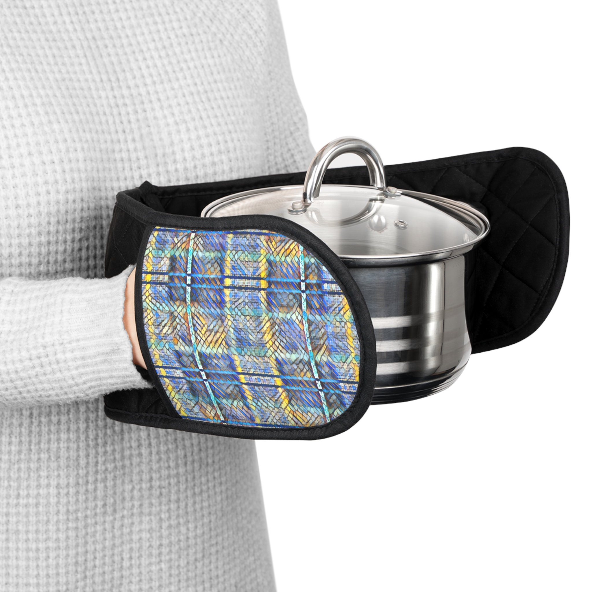 This kitchen accessory is two mitts in one! Stick you hands in the pockets and have plenty of room in between to grab a casserole dish, baking sheet, or pan. The simple black, cotton construction is lightweight and slip-resistant. The artwork on the hand pockets adds a colorful touch that can be matched with other kitchen accessories from the “Plaids” Collection.