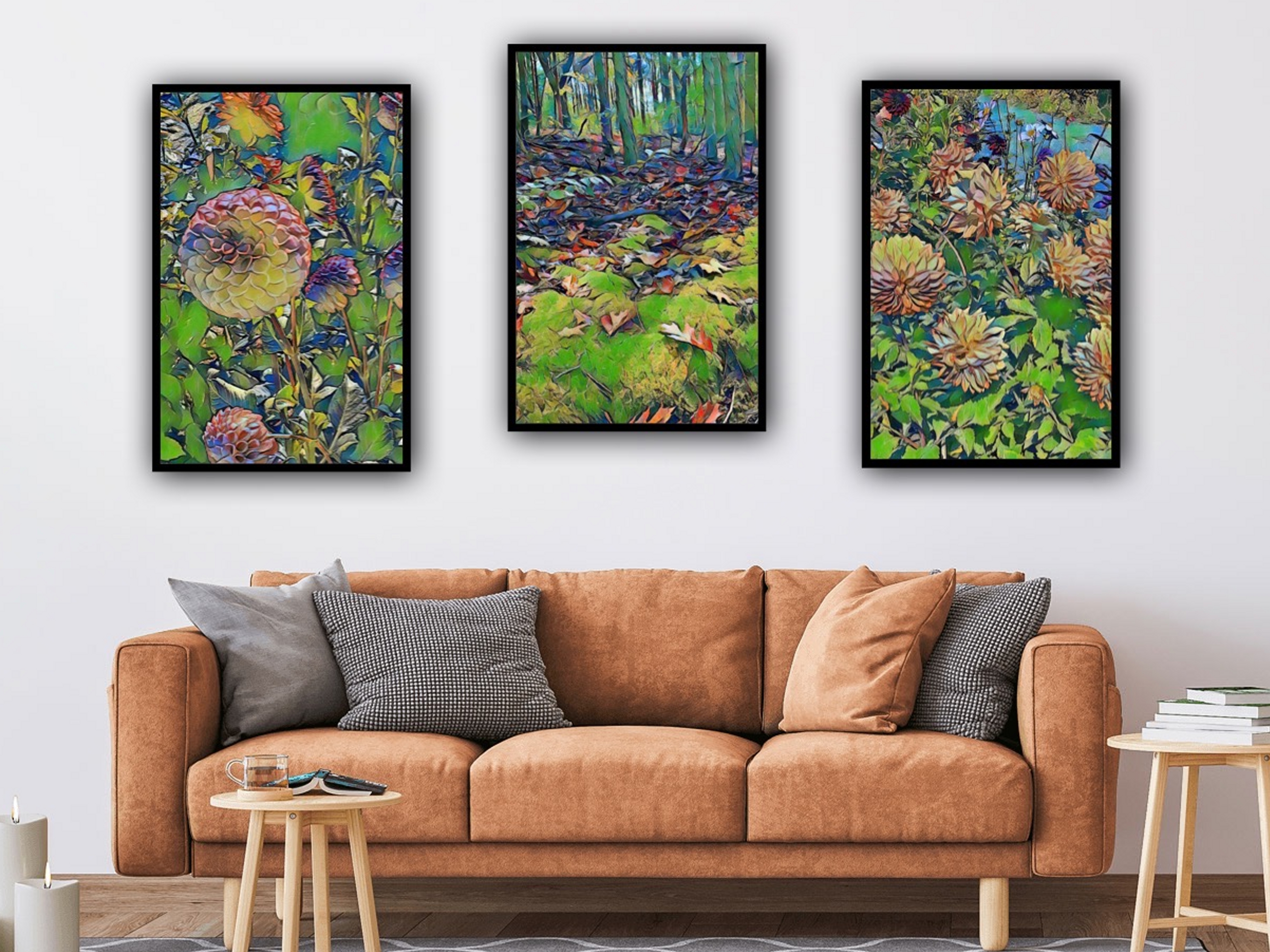“Flower Lagoon” began as a photo of ordinary pretty flowers. After painting the photo with pastel effects, now it has vibrant blends of yellows, oranges, teals, and greens!