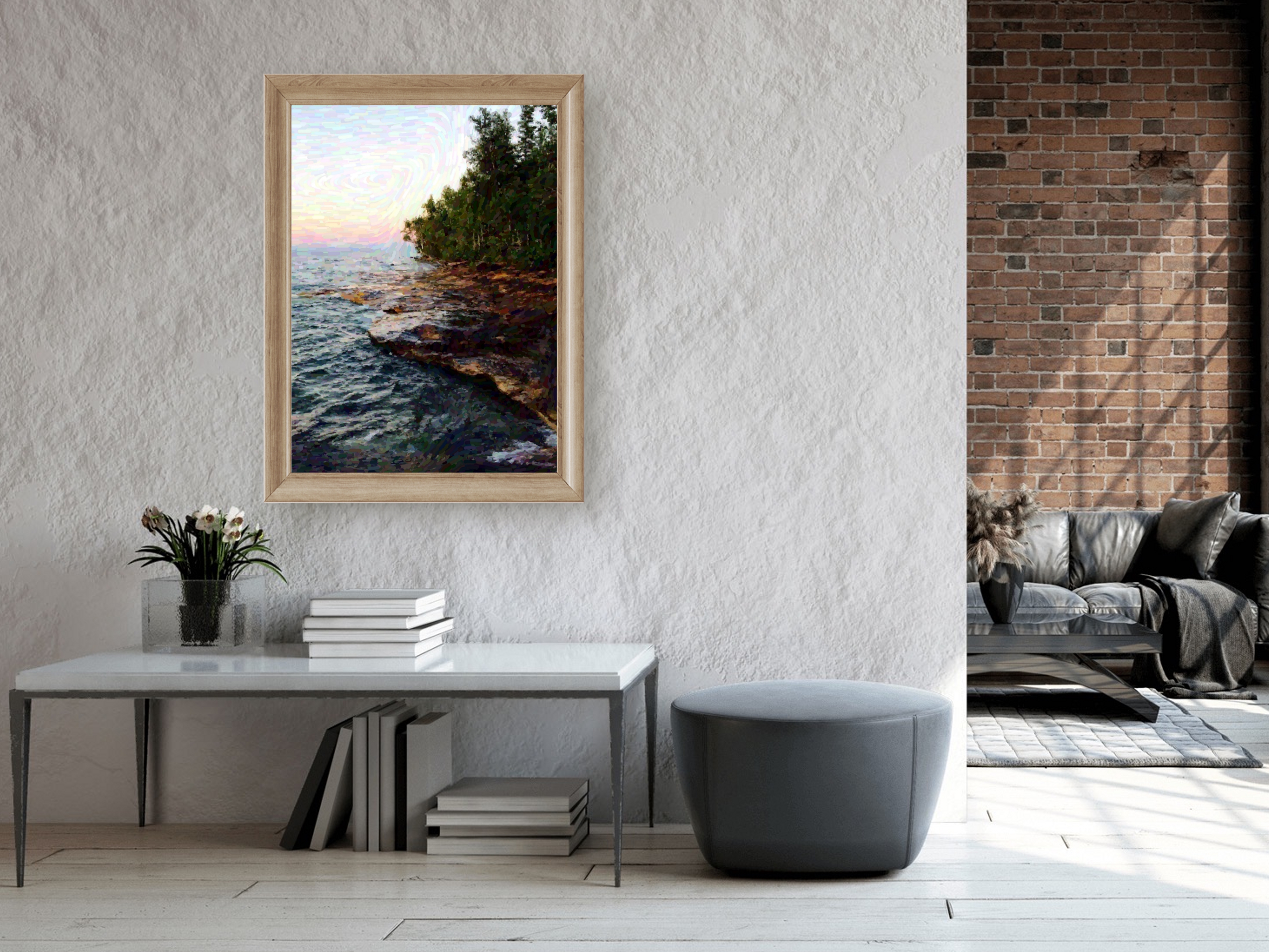 “Lake Superior Shore” started as a photo taken at sunset along Lake Superior’s rocky edge near Grand Marais. Now enhanced with whimsical effects, this artwork has beautiful swirls of color that bring the waves and sky back to life.