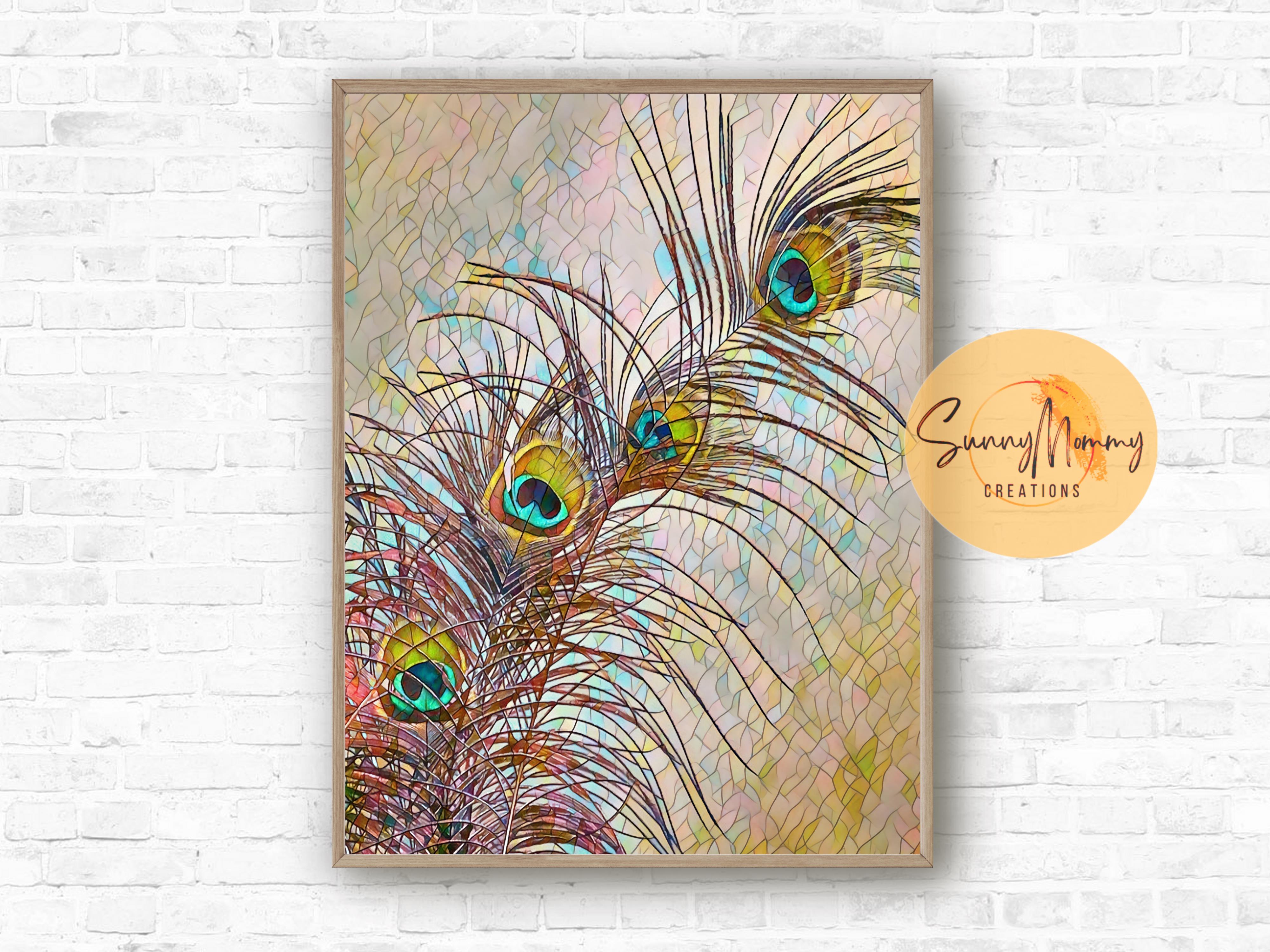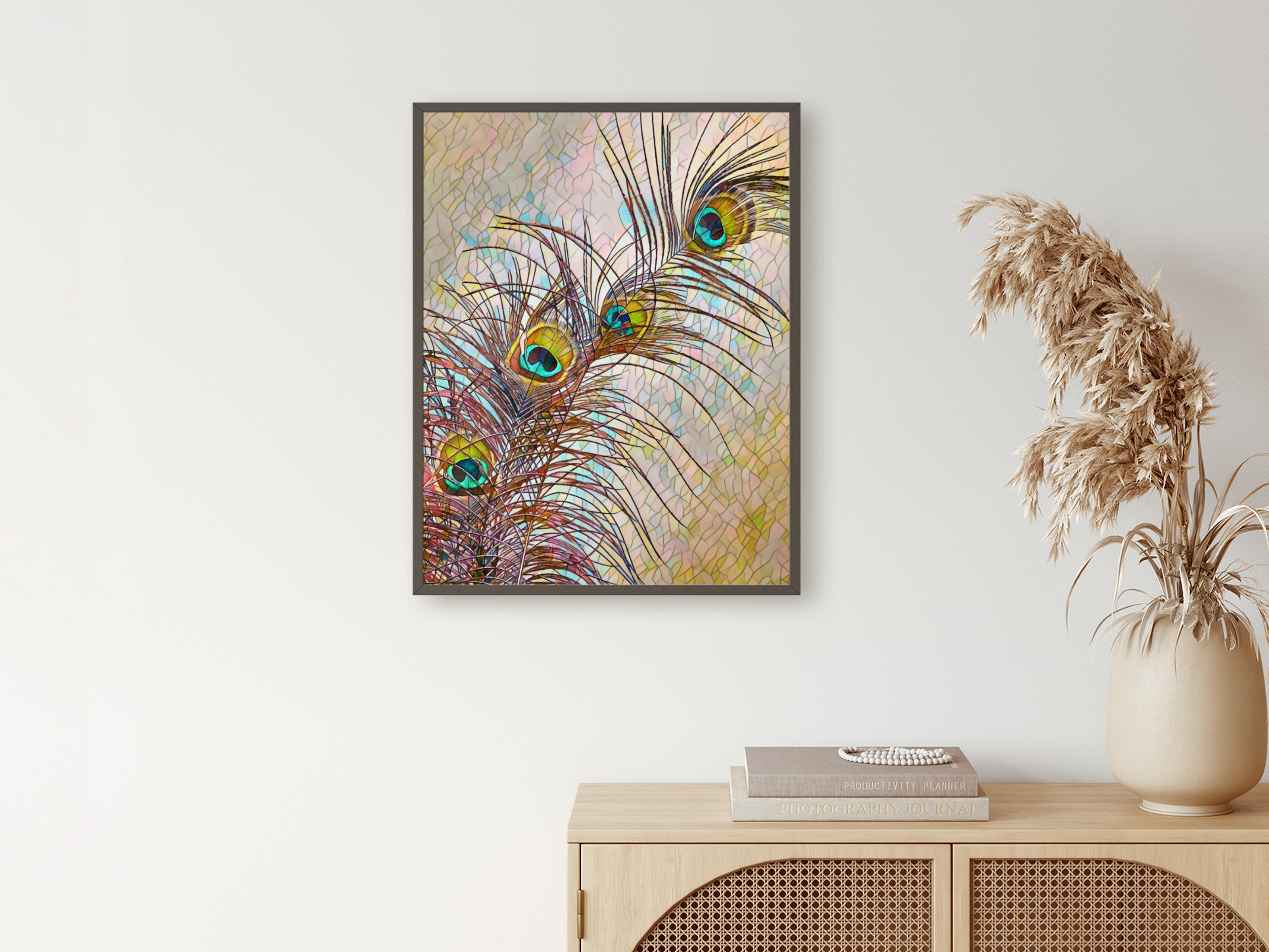 “Peacock Feathers” started as a simple photo of decorative, real feathers standing in a vase. Now with mosaic effects added to the photo, this artwork has textured color in the background and stunning detail on the feathers themselves.