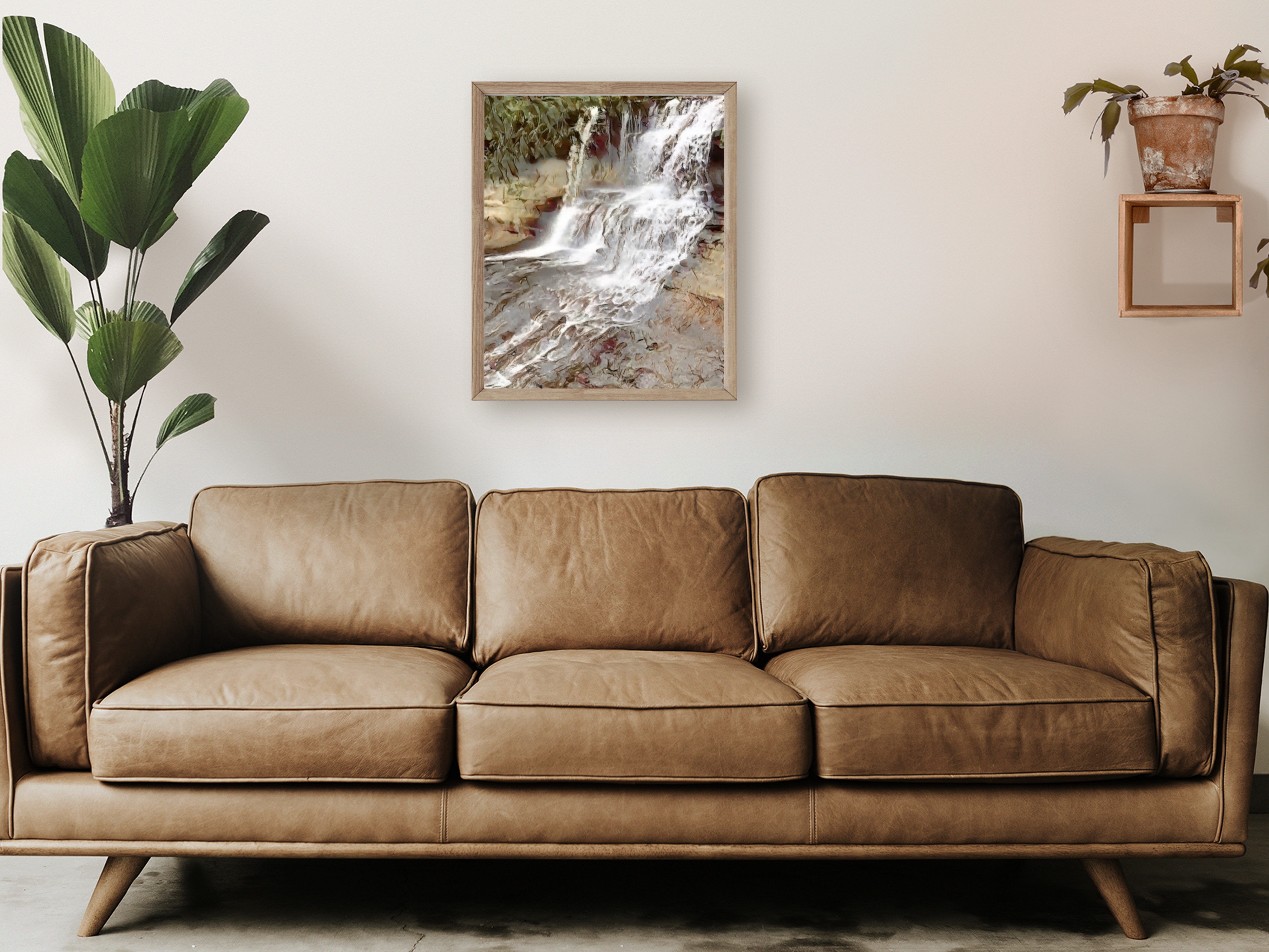 “Waterfall Watercolor” began as a photo of a sloping waterfall in the Upper Peninsula of Michigan. Now painted over with watercolor effects, this artwork is a calming and beautiful nature scene, awash in white.