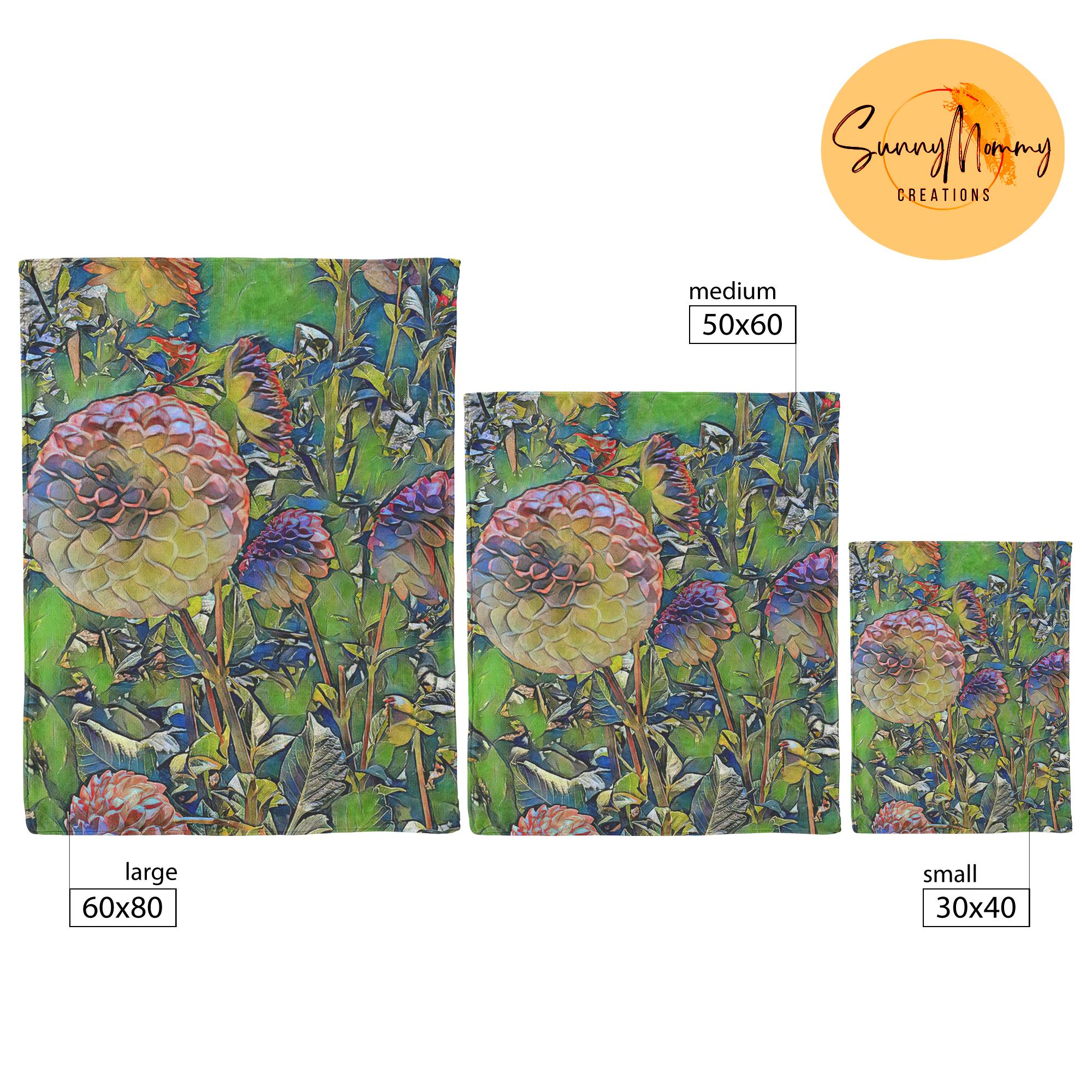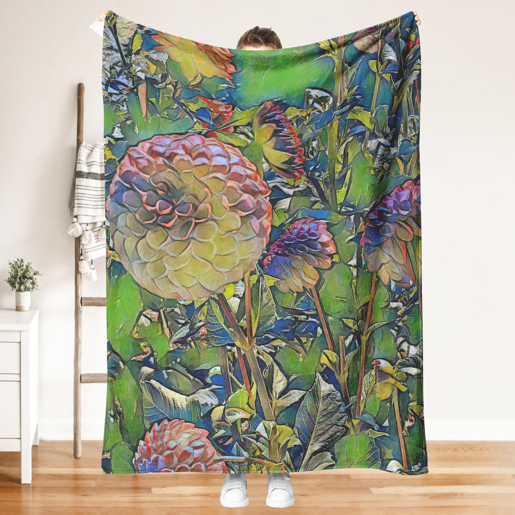 This throw blanket is a bold floral accent to drape on a bed, couch, chair, or blanket ladder. Its lightweight, velveteen fleece is extremely soft and cozy. Whatever size you choose, this blanket pairs nicely with the throw pillows from the “Dahlias With a Splash of Lime” Collection.