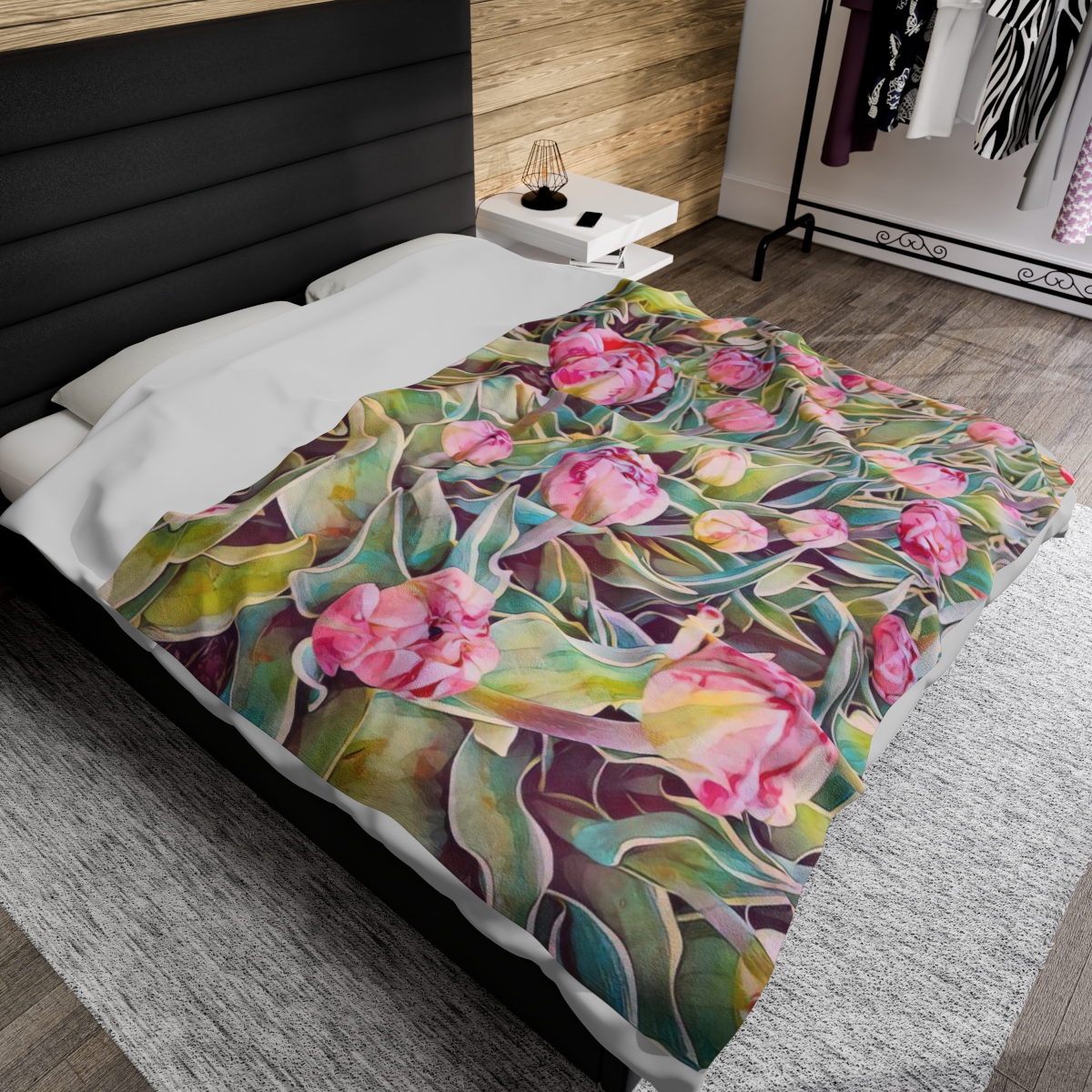 This throw blanket is a lovely accent to drape on a bed, couch, chair, or blanket ladder. Its lightweight, velveteen fleece is extremely soft and cozy. Whatever size you choose, this blanket pairs nicely with the throw pillows from the “Pink Blooms” Collection.