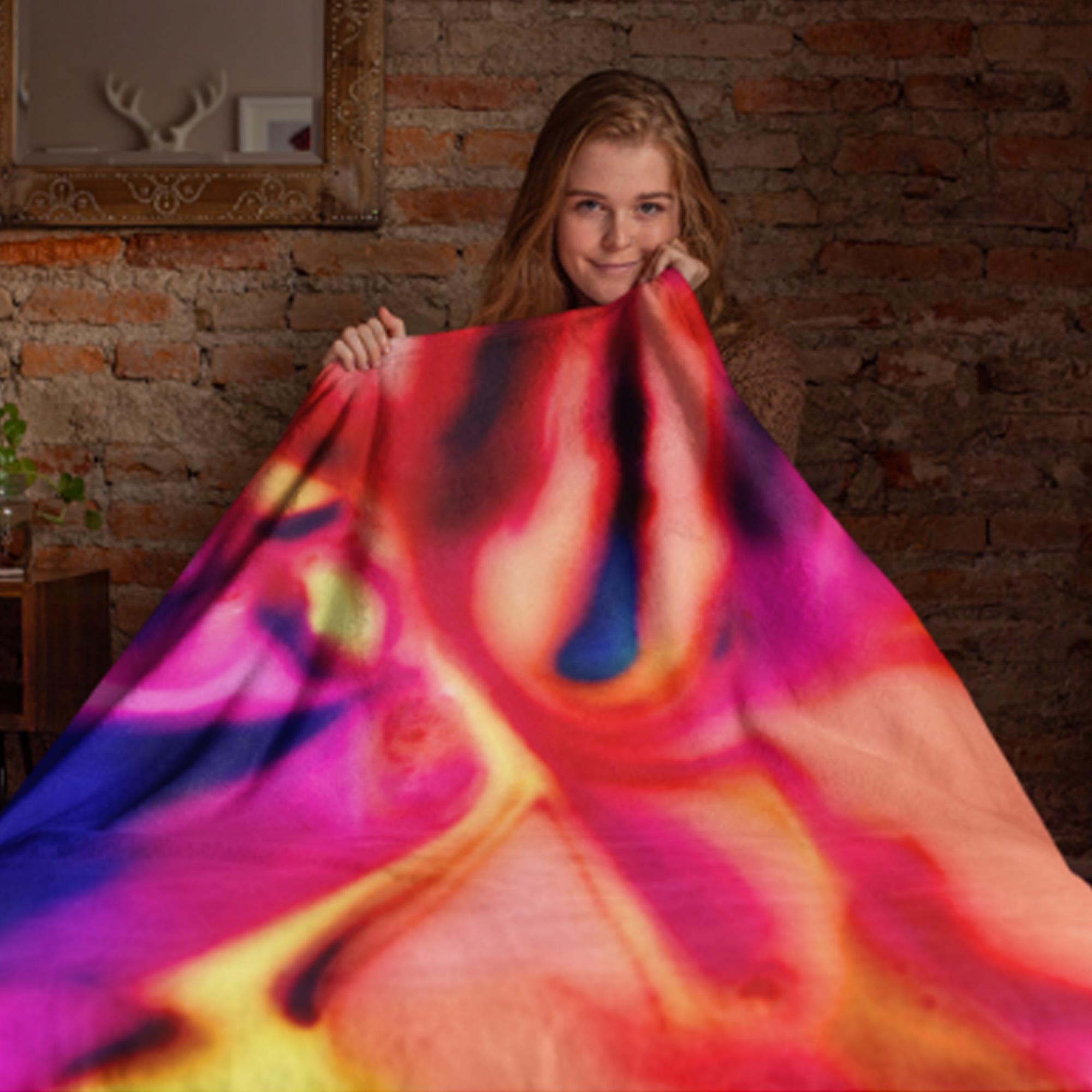 Wrap up in lots of bright color! This throw blanket is a pretty accent to drape on a bed, couch, chair, or blanket ladder. Its lightweight, velveteen fleece is extremely soft and cozy. Whatever size you choose, this blanket pairs nicely with the throw pillows from the “Pink Tie Dye” Collection.