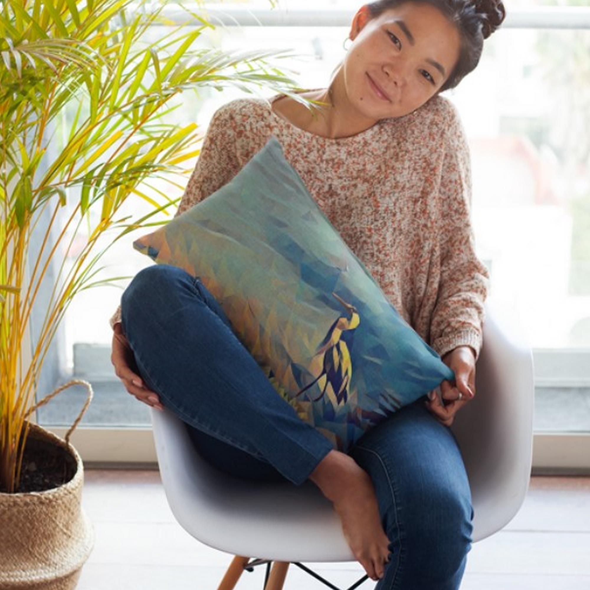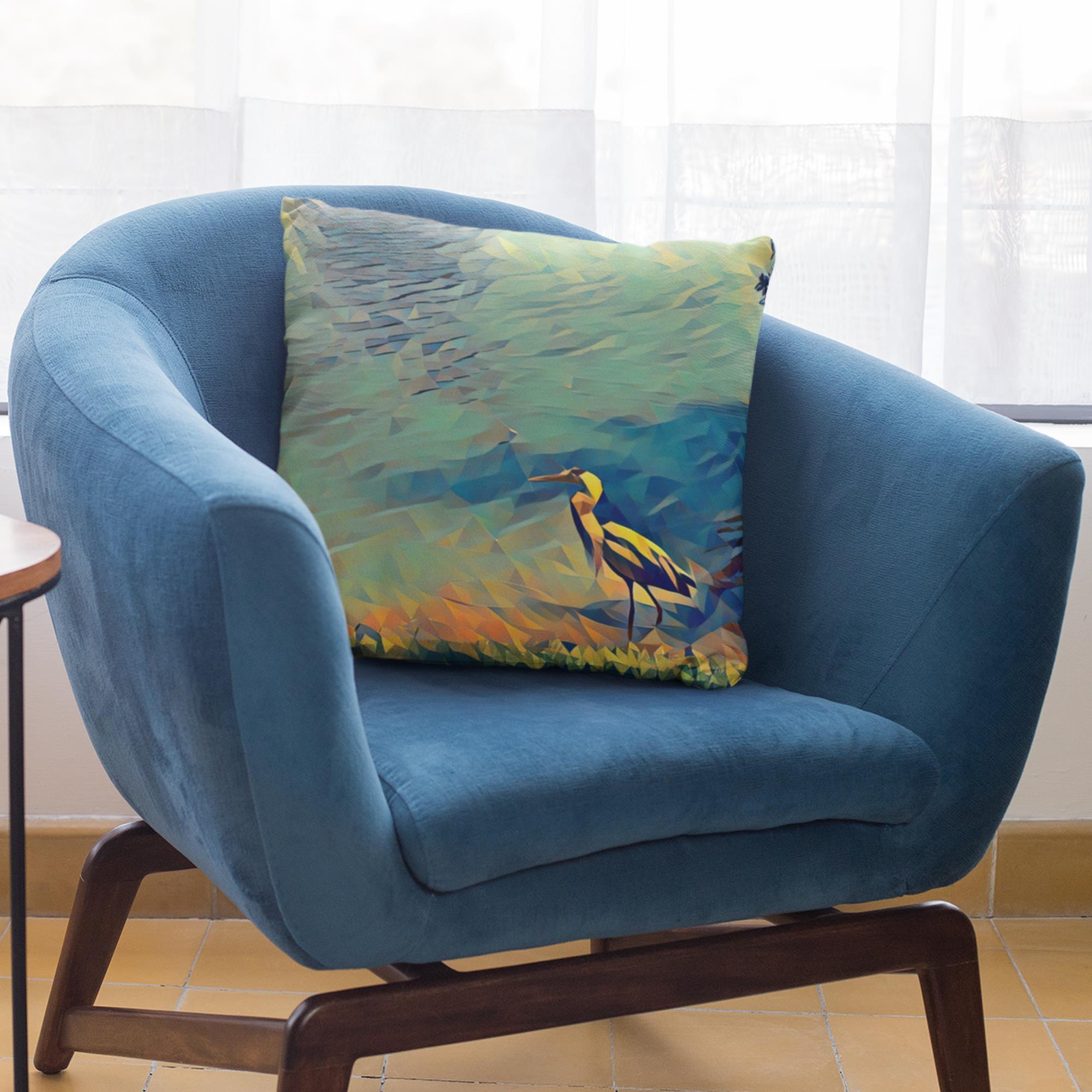One of three throw pillows in the “Bird Gone Fishing” Collection. Display alone or mix and match with others for complementing pillow arrangements. Also pairs nicely with the collection’s blanket for a comfy set.