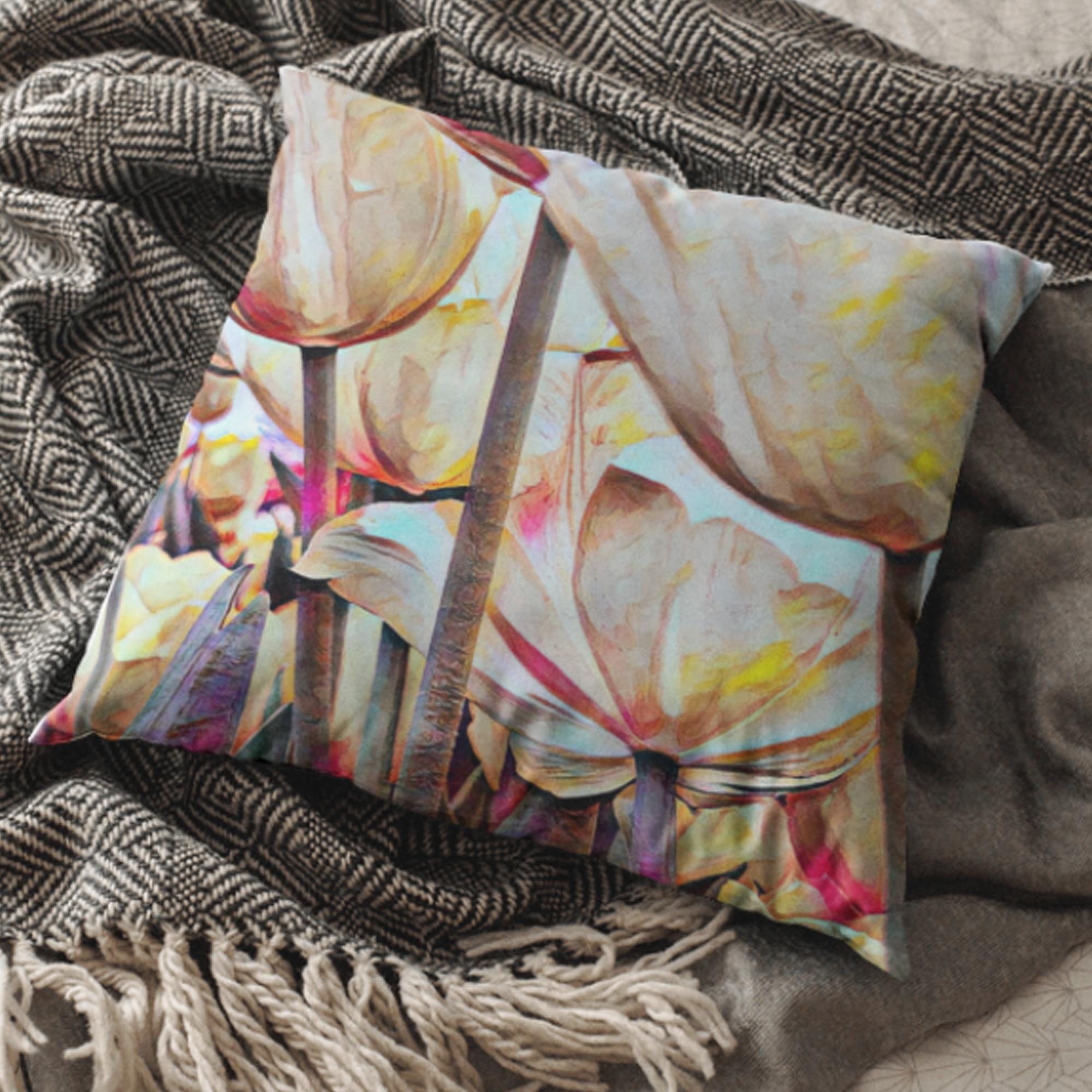 Pretty with warm floral colors, this single pillow from the “Golden Tulips” Collection is lovely enough to stand on its own, or combine it with the collection’s blanket for a comfy set.
