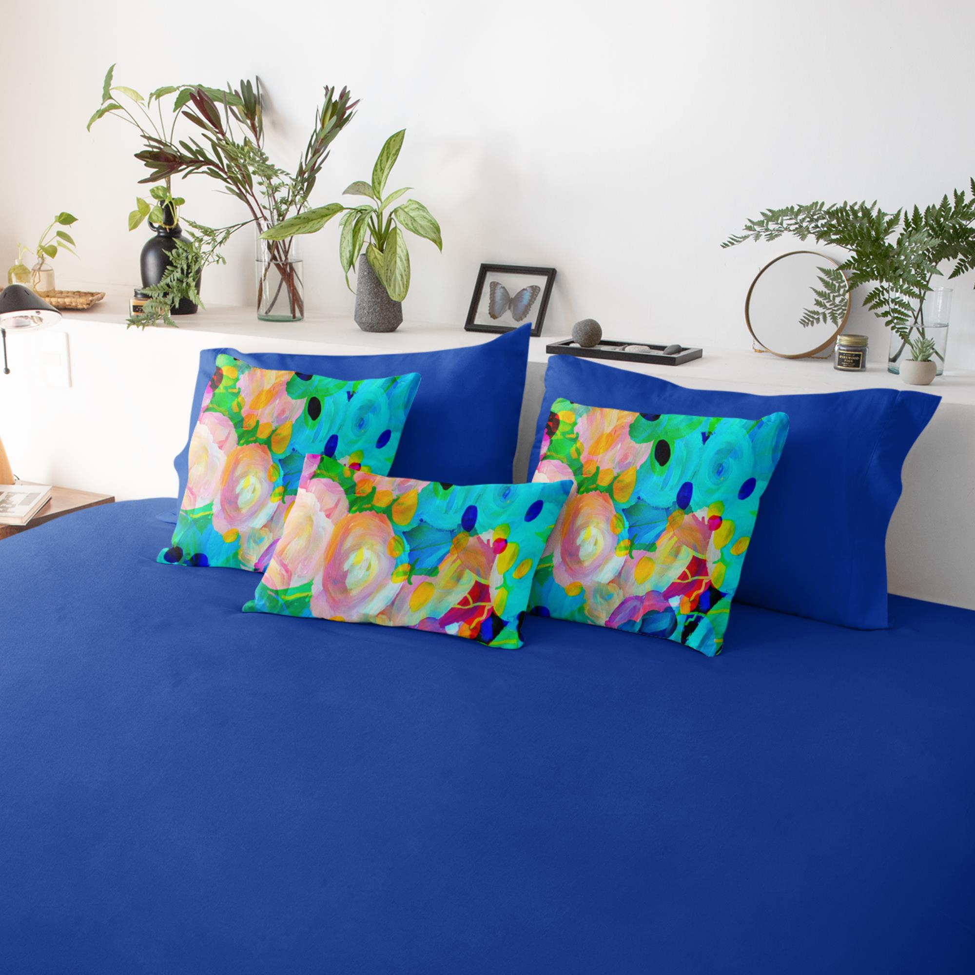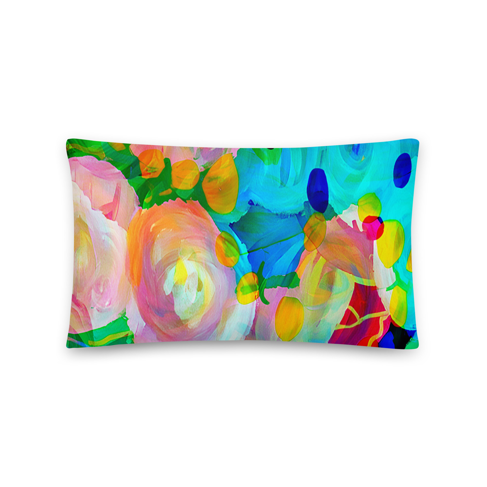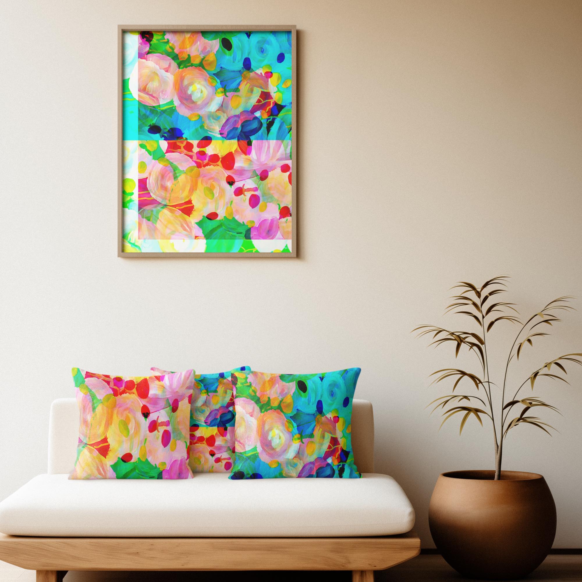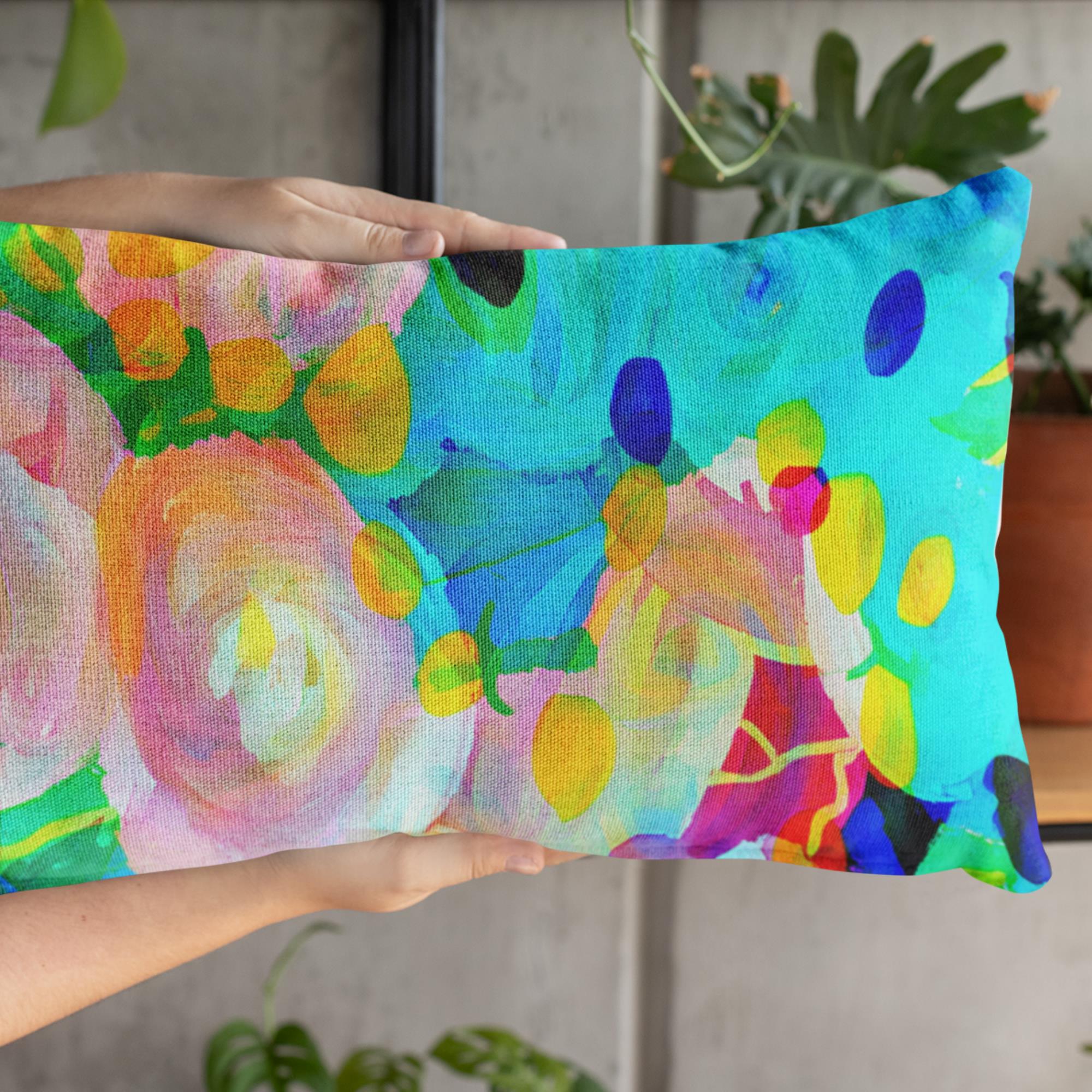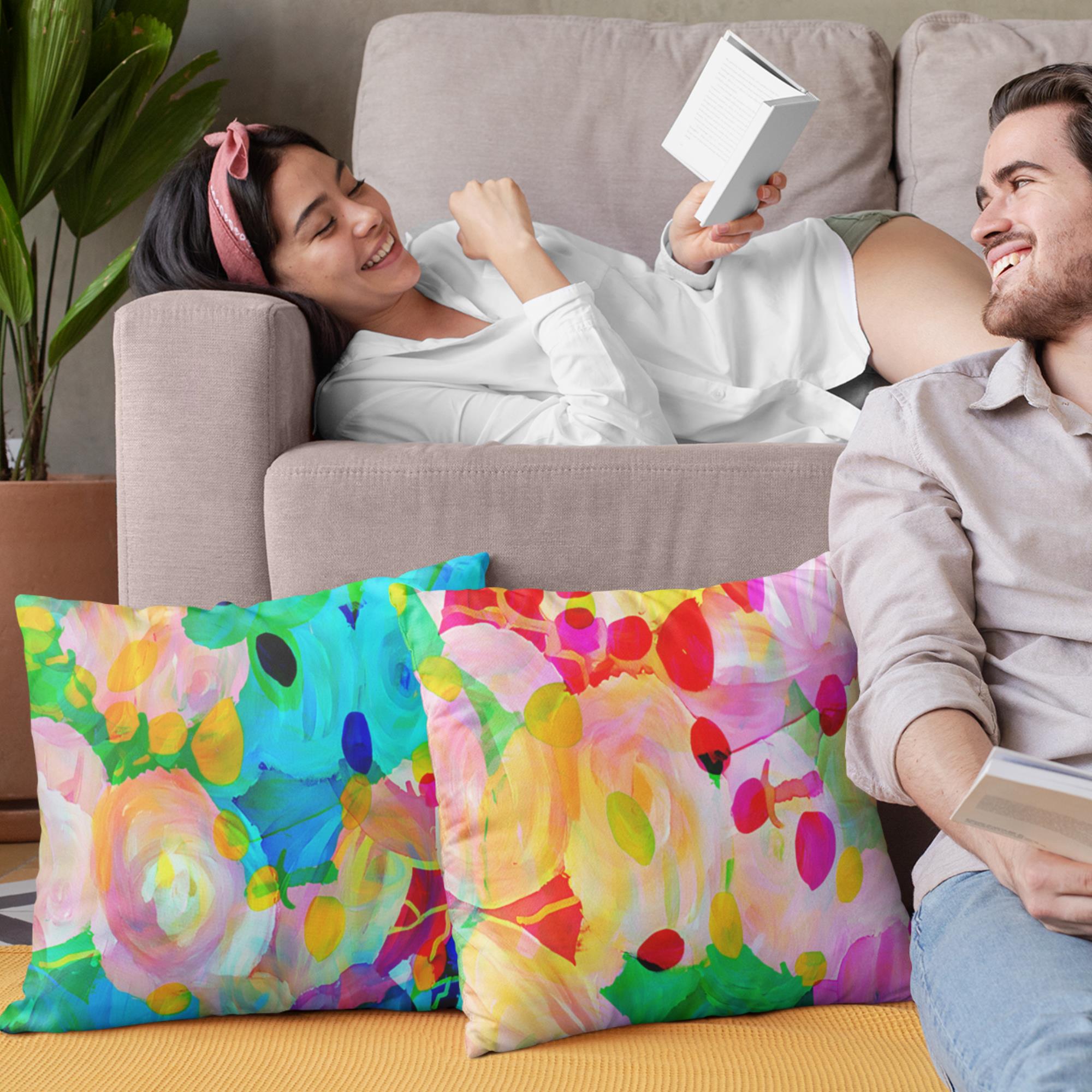 One of three throw pillows in the “Painted Pop Art” Collection. Display alone or mix and match with others for complementing pillow arrangements.