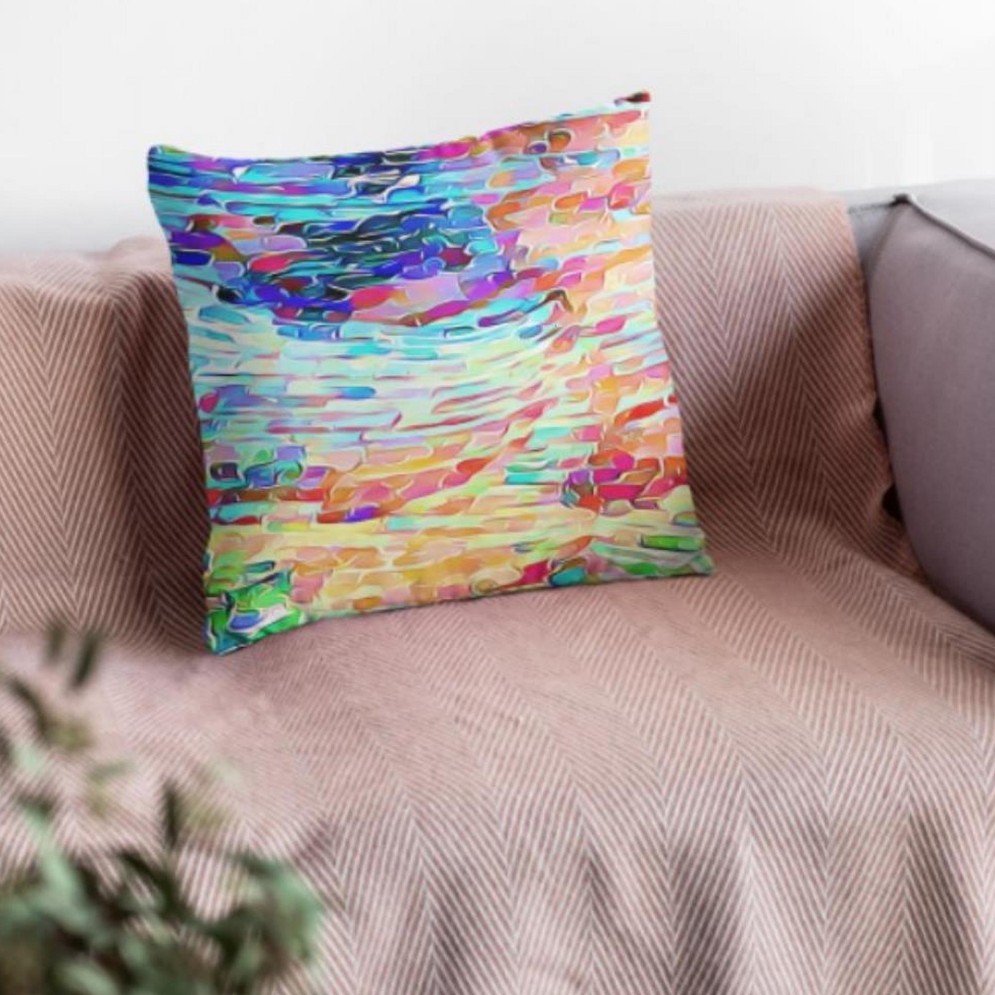 One of three throw pillows in the “Rainbow Scales” Collection. Display alone or mix and match with others for complementing pillow arrangements. Also pairs nicely with the collection’s blanket for a comfy set.