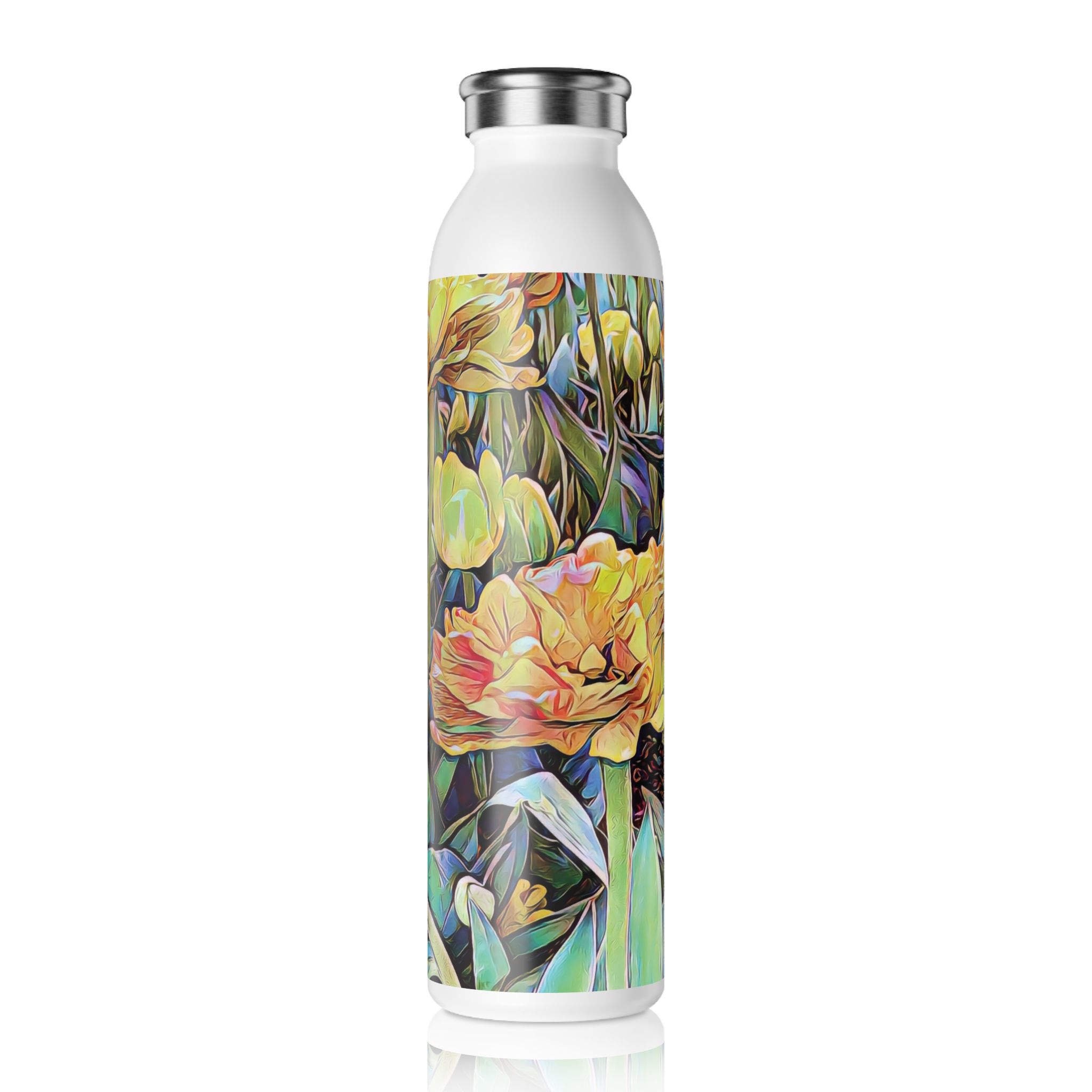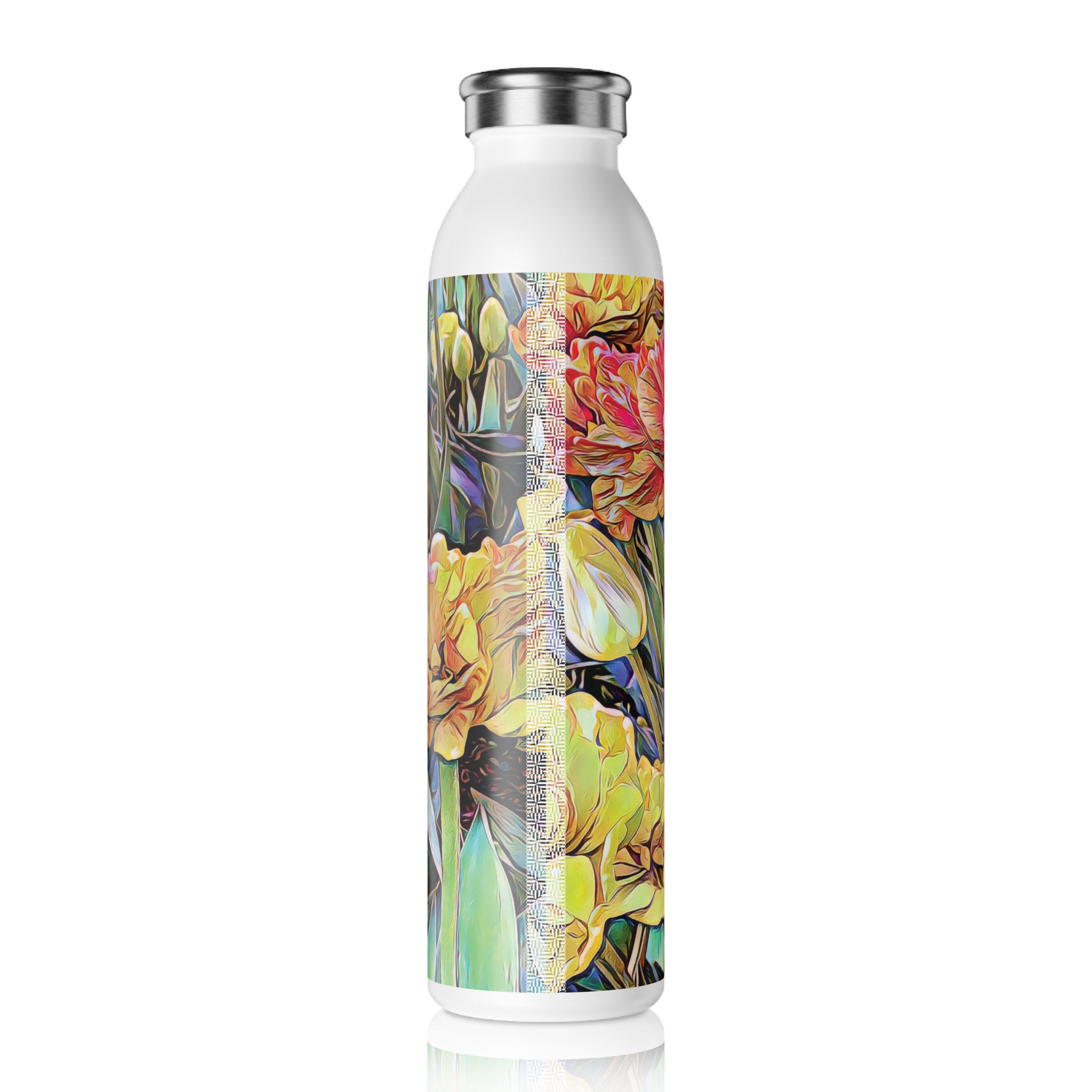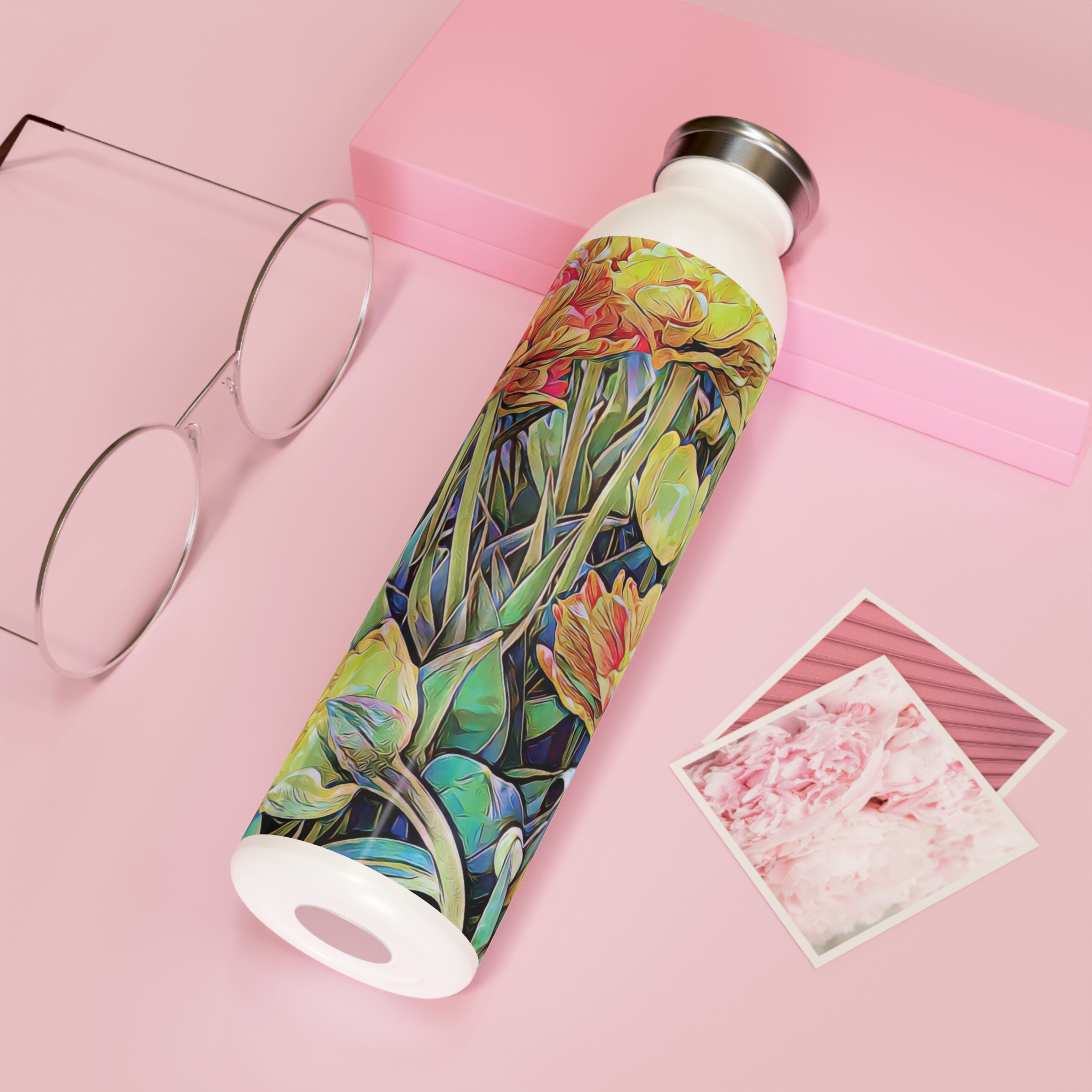 Fill up the “Pastel Garden” Collection’s water bottle and take a piece of art wherever you go! This 20-ounce bottle is easy to refill and seals tight for worry-free storage in your bag, purse, or car. With a double-wall stainless steel frame, this water bottle utilizes vacuum insulation to keep both hot and cold drinks at perfect temps for hours.