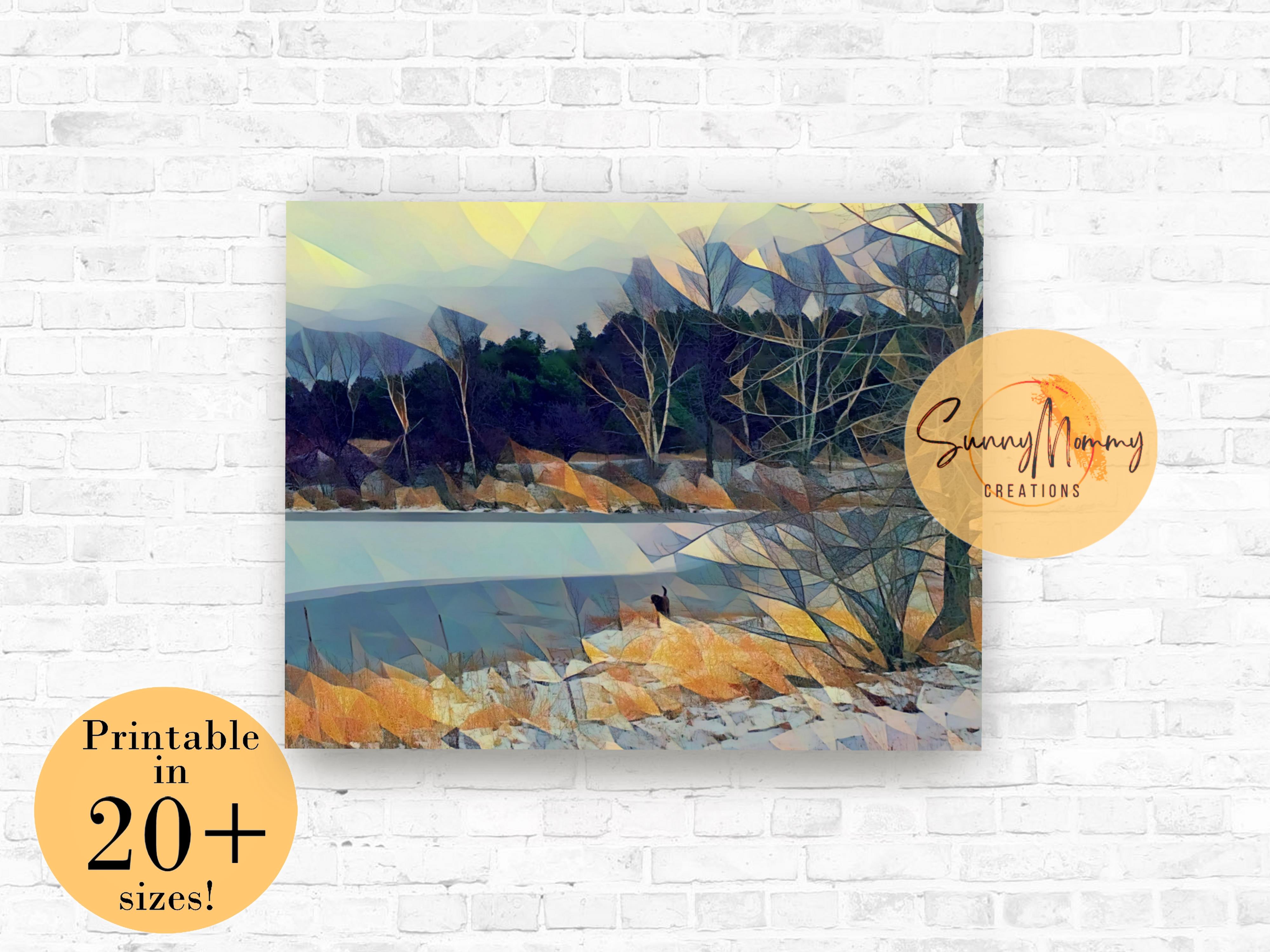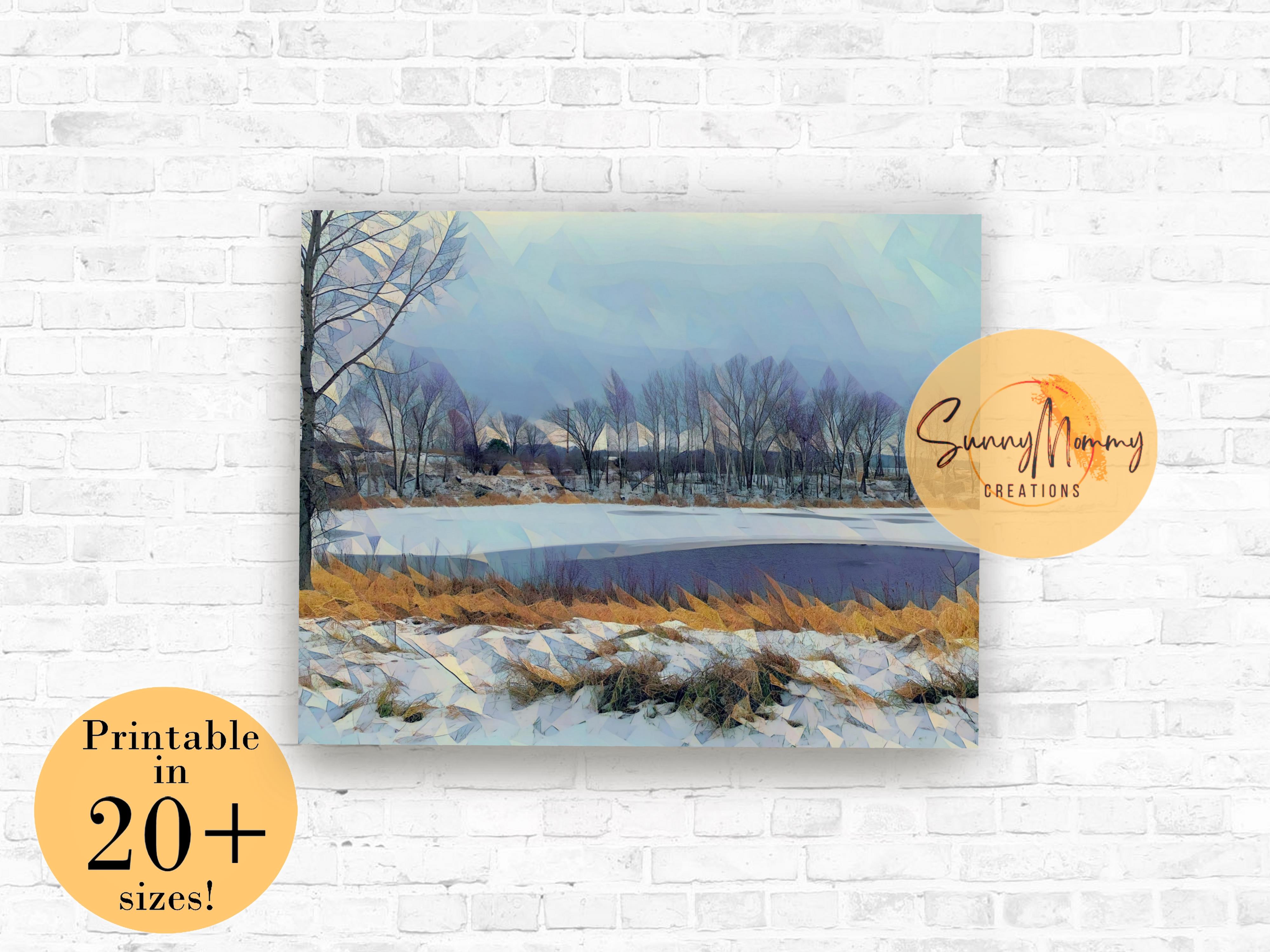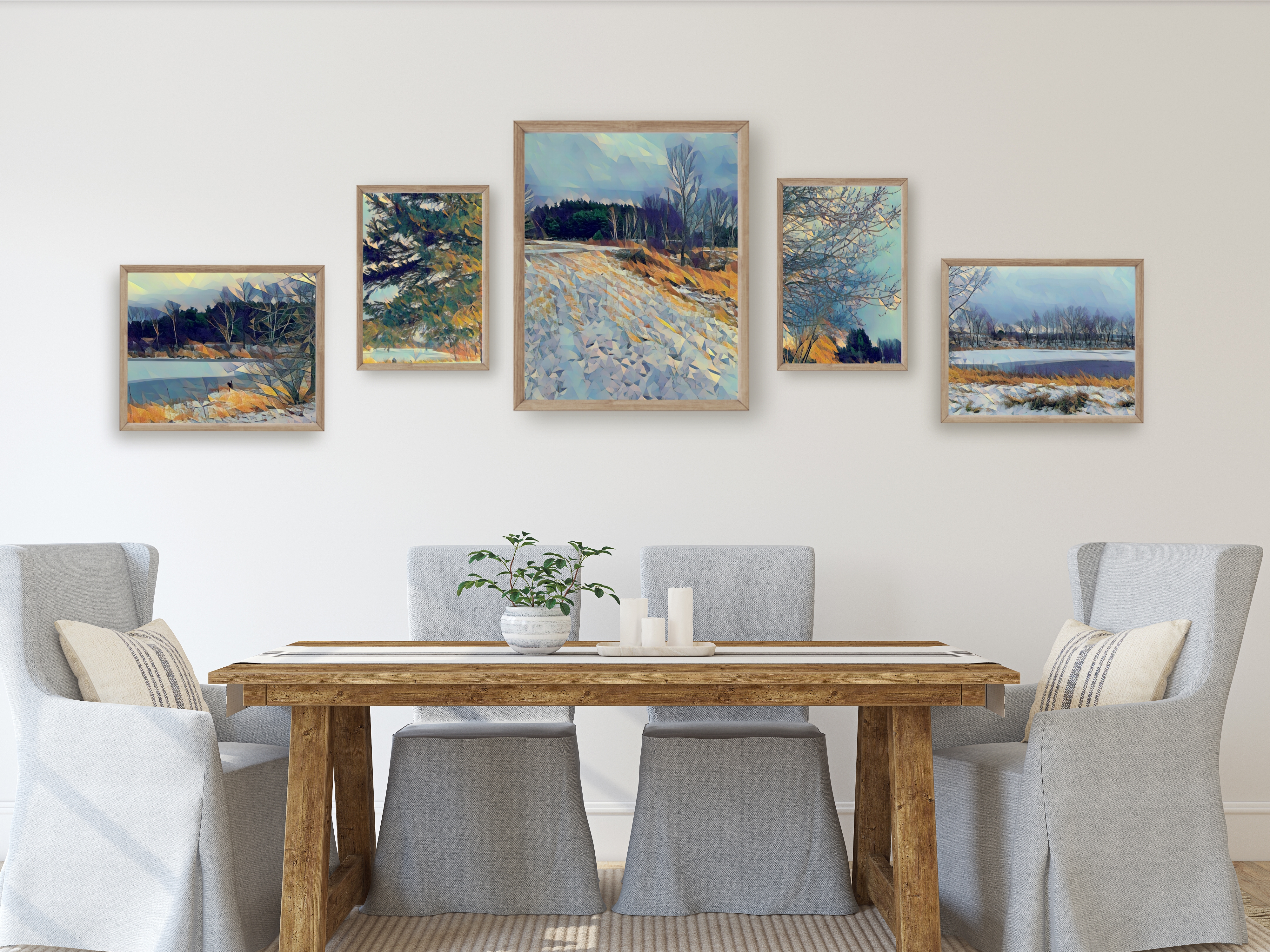 “Winter Scenes (Poly Blue)” began with a stroll on a brisk winter day, snapping photos while keeping track of an adventurous dog. Now painted with a unifying poly art style in blue, these snow-covered landscapes make a beautiful set of 5.